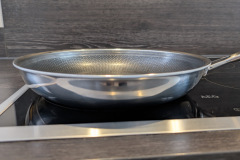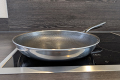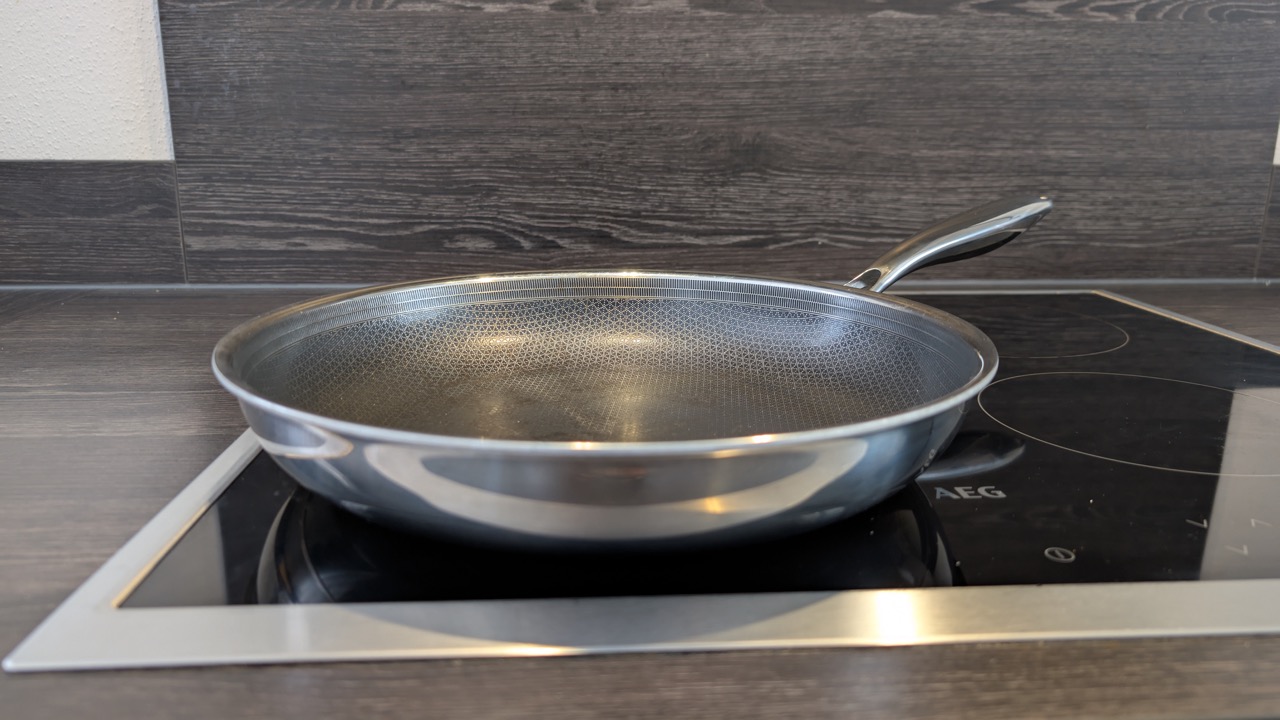 Die Bratpfanne überzeugt auf den ersten Blick mit einem eleganten und modernen Design. Der Materialmix aus Edelstahl und Aluminium wirkt nicht nur hochwertig, sondern unterstreicht den professionellen Anspruch des Produkts. Das charakteristische Hexagon-Muster der patentierten Hybrid-Beschichtung verleiht der Pfanne zudem einen technischen und zugleich edlen Look.