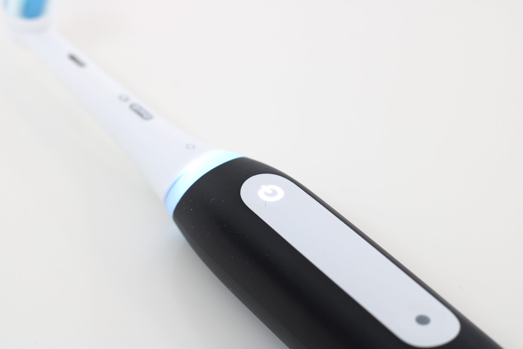 Auch die Verarbeitungsqualität ist auf dem gewohnt hohen iO-Niveau. Das Gehäuse sowie der Bürstenkopf sind aus wertigem Kunststoff gegossen. Wir können das Material selbst unter hohem Druck nicht verformen – hervorragend. Somit schützt das Gehäuse den Motor im Inneren gut vor Erschütterungen. In der Praxis ist es auch kein Problem, wenn die Zahnbürste versehentlich auf den Badezimmerboden knallt. Sehr schön: Der Spalt zwischen Handstück und Bürstenkopf ist sogar minimal kleiner im Vergleich zur iO Series 10. Somit lagern sich Zahnpastarückstände nicht so leicht ab. Die Bedieneinheit mit den beiden Tasten ist perfekt in das restliche Gehäuse integriert, auch hier haben wir nichts zu beanstanden.