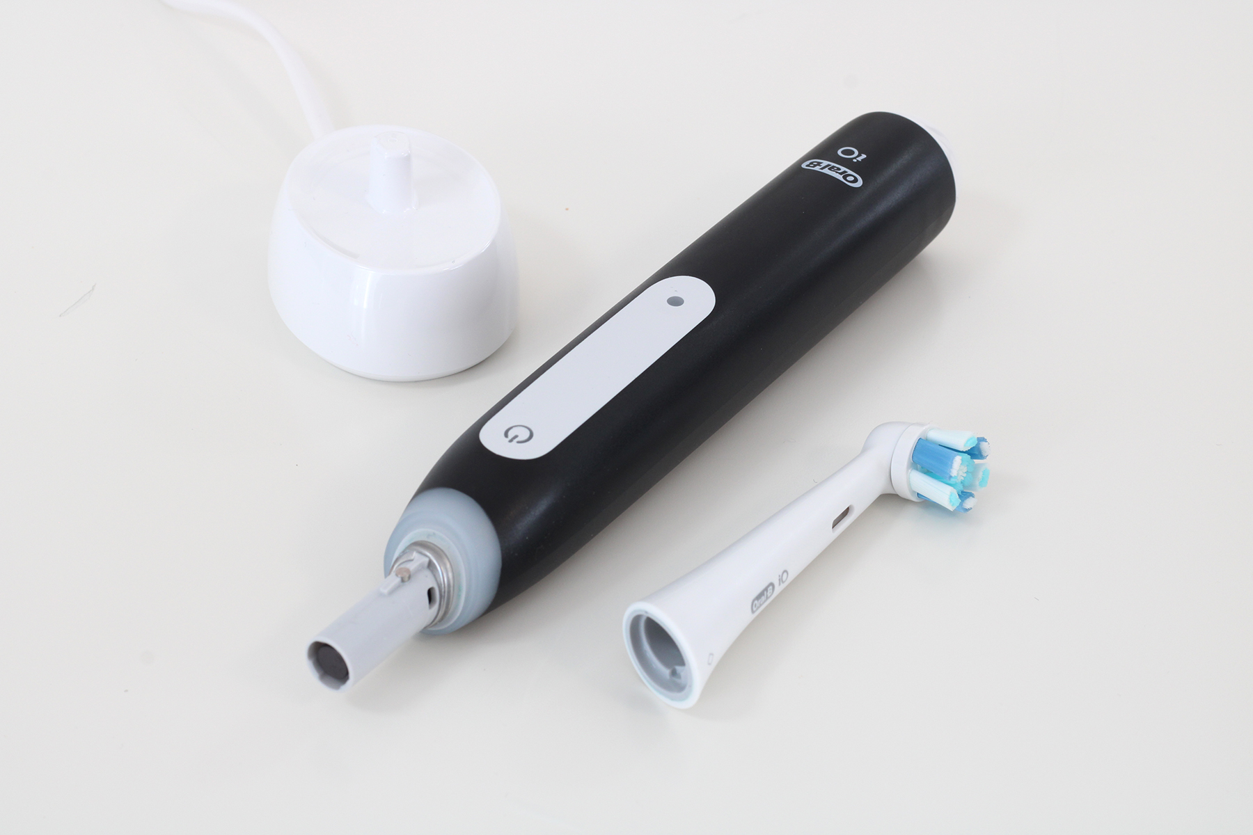 Für den Test steht uns die Farbvariante Matt Black zur Verfügung. Das bezieht sich jedoch nur auf das Handteil, der Bürstenkopf ist in mattem Weiß gehalten. Uns gefällt die klassische Farbkombi gut, hier dürften sich viele Nutzerinnen und Nutzer wiederfinden. Das Design ist im Vergleich zur Series 10 nahezu unverändert. Wir erkennen sofort, dass es sich um eine iO-Zahnbürste handelt. Sie besticht durch eine zurückhaltende, klare Formgebung und sieht gewohnt edel aus. Hier müssen Nutzerinnen und Nutzer trotz des günstigeren Preises keine Einschränkungen in Kauf nehmen.
