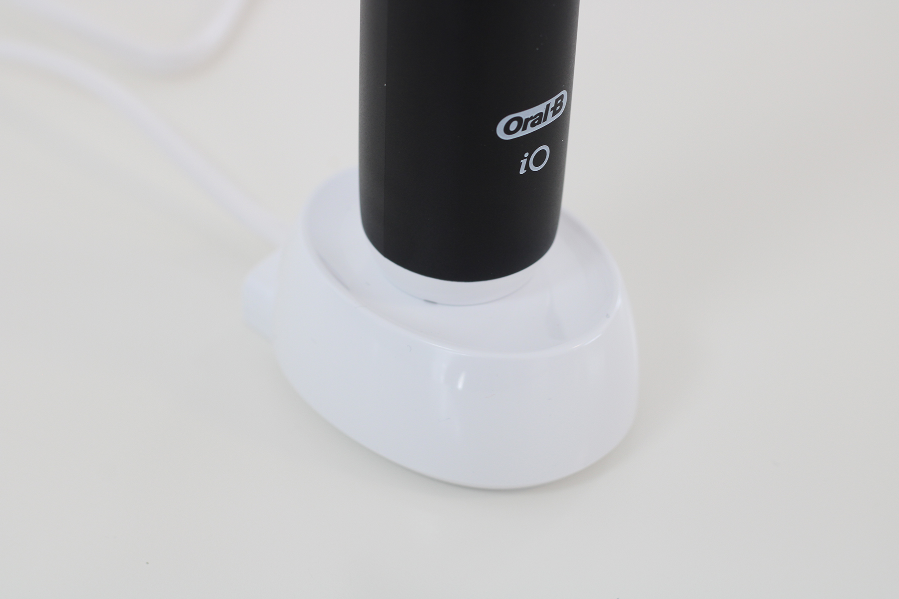 Das Gehäuse ist zu einem Großteil glatt, trotzdem ist die Zahnbürste recht griffig. Wir haben hier im Test keine Probleme. Einzig unter der Dusche kann es hin und wieder Probleme mit der rutschigen Oberfläche geben. Wie bereits erwähnt, muss die iO Series 3n ohne Display auskommen, dafür ist der Bereich zwischen den Tasten gummiert. Einen Griffigkeitsvorteil stellen wir dadurch jedoch nicht fest. Die Standfestigkeit ist nicht optimal. Es braucht nur einen leichten Schubser und die elektrische Zahnbürste fällt. Da die Unterseite der Ladestation ebenfalls sehr rutschig ist, bringt es auch keinen wirklichen Vorteil, die iO hier abzustellen.