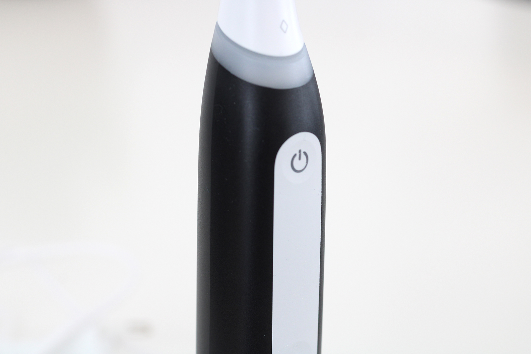 Auch die Verarbeitungsqualität ist auf dem gewohnt hohen iO-Niveau. Das Gehäuse sowie der Bürstenkopf sind aus wertigem Kunststoff gegossen. Wir können das Material selbst unter hohem Druck nicht verformen – hervorragend. Somit schützt das Gehäuse den Motor im Inneren gut vor Erschütterungen. In der Praxis ist es auch kein Problem, wenn die Zahnbürste versehentlich auf den Badezimmerboden knallt. Sehr schön: Der Spalt zwischen Handstück und Bürstenkopf ist sogar minimal kleiner im Vergleich zur iO Series 10. Somit lagern sich Zahnpastarückstände nicht so leicht ab. Die Bedieneinheit mit den beiden Tasten ist perfekt in das restliche Gehäuse integriert, auch hier haben wir nichts zu beanstanden.