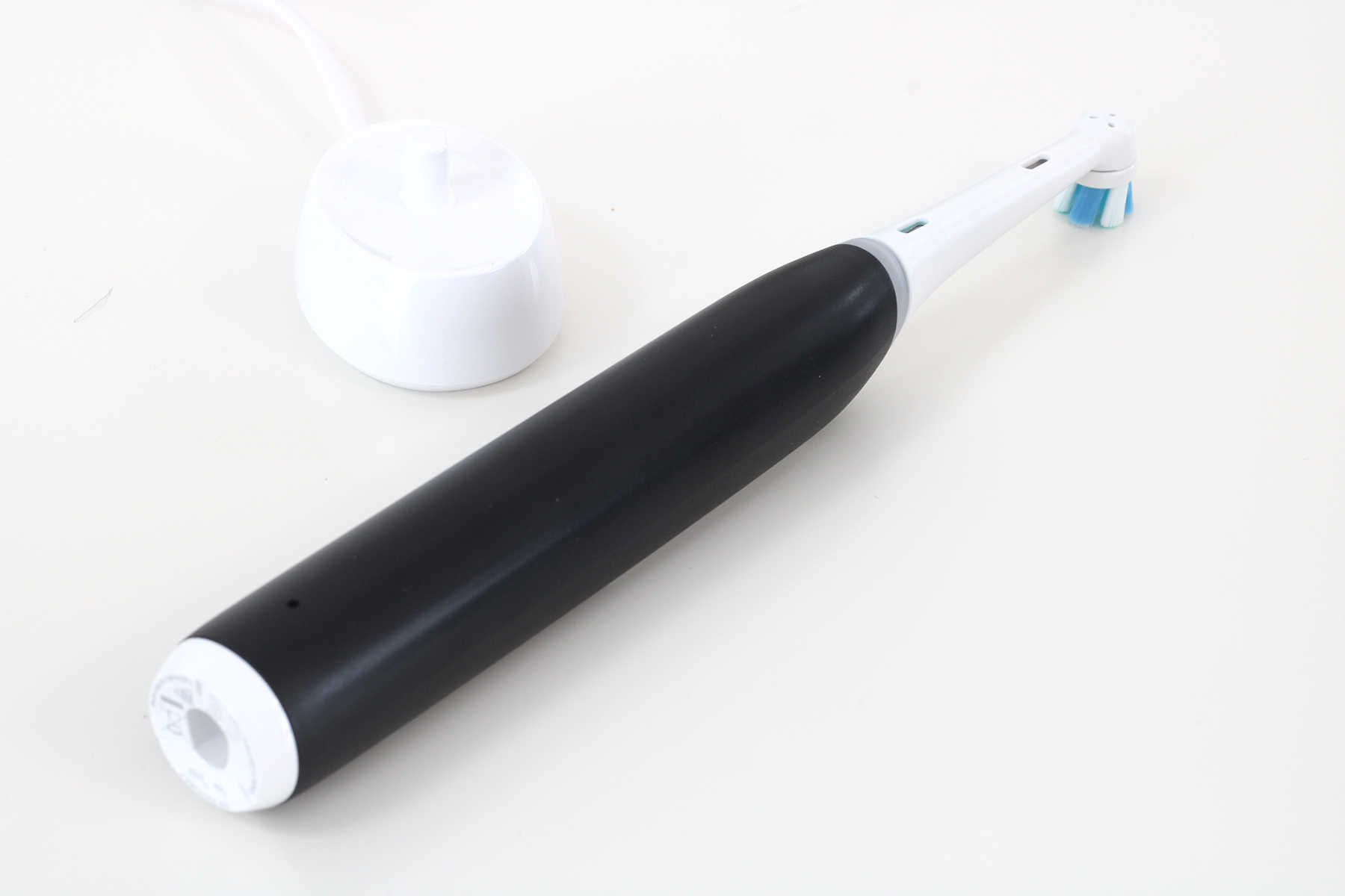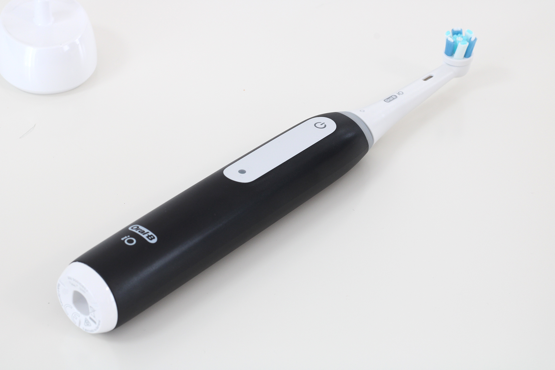 Für den Test steht uns die Farbvariante Matt Black zur Verfügung. Das bezieht sich jedoch nur auf das Handteil, der Bürstenkopf ist in mattem Weiß gehalten. Uns gefällt die klassische Farbkombi gut, hier dürften sich viele Nutzerinnen und Nutzer wiederfinden. Das Design ist im Vergleich zur Series 10 nahezu unverändert. Wir erkennen sofort, dass es sich um eine iO-Zahnbürste handelt. Sie besticht durch eine zurückhaltende, klare Formgebung und sieht gewohnt edel aus. Hier müssen Nutzerinnen und Nutzer trotz des günstigeren Preises keine Einschränkungen in Kauf nehmen.