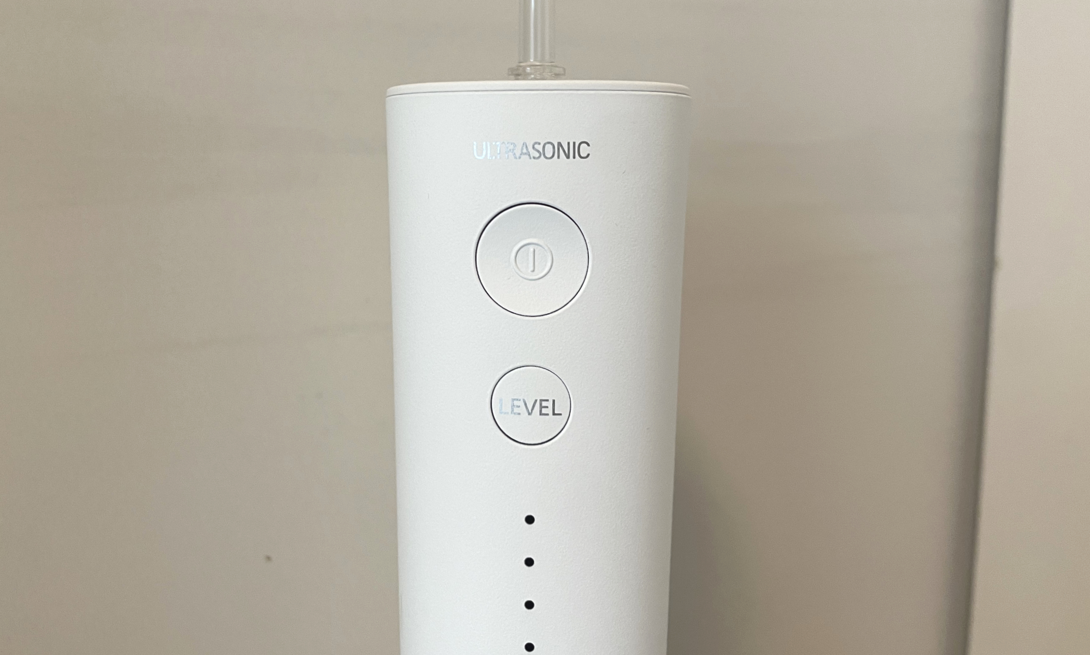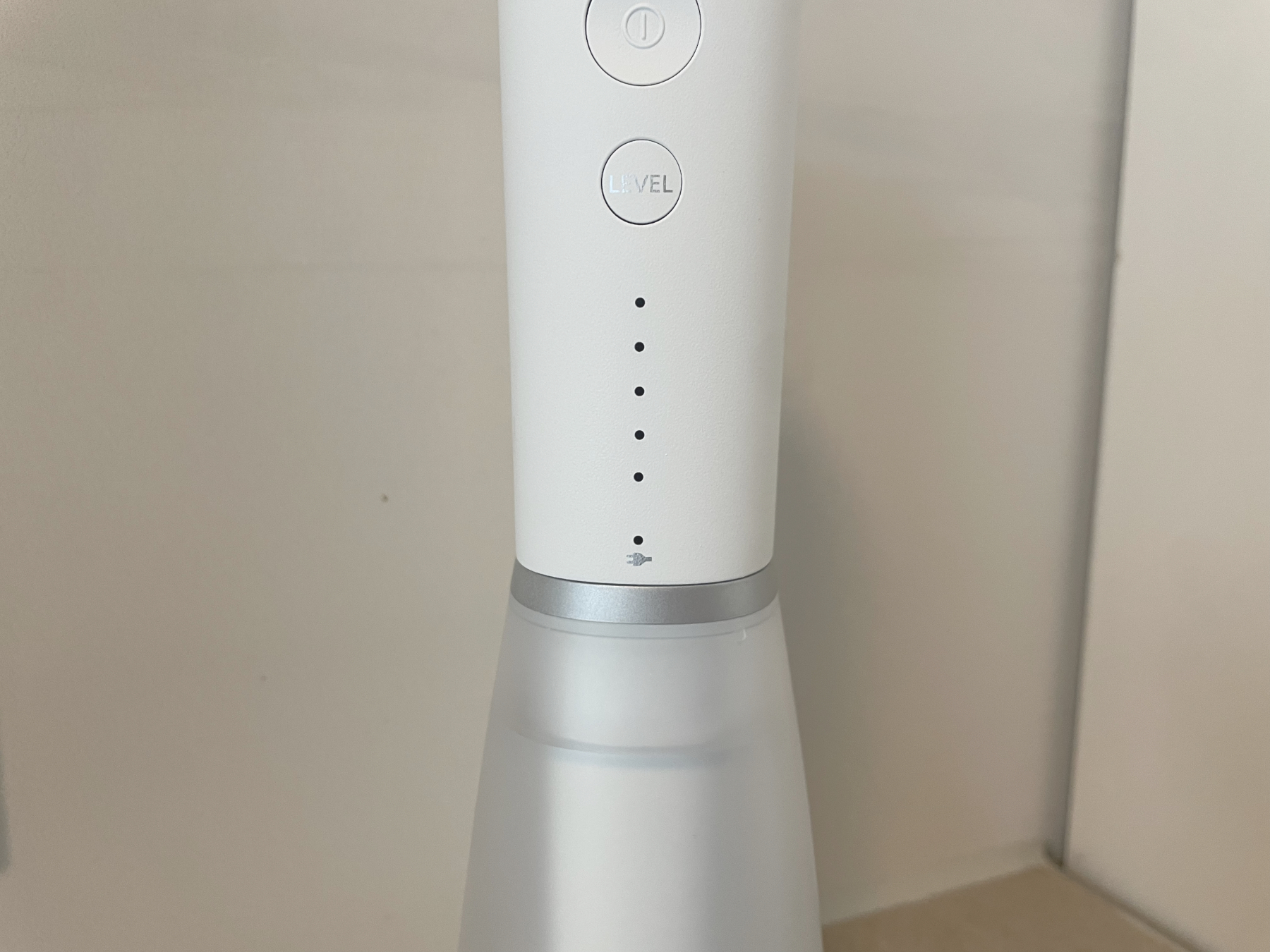 Die Panasonic Munddusche EW-DJ86 verfügt über 3 Tasten, die eine einfache und intuitive Bedienung ermöglichen. Auf der Vorderseite befinden sich die Power- und Level-Taste. Mit dem Powerbutton schalten wir das Gerät ein und aus, während wir mit dem Level-Knopf zwischen den fünf Leistungsstufen des Geräts wechseln können. Die aktuell ausgewählte Stufe lässt sich problemlos an einer fünfstufigen LED-Anzeige ablesen, was uns die Orientierung erleichtert und in der Praxis gut funktioniert.