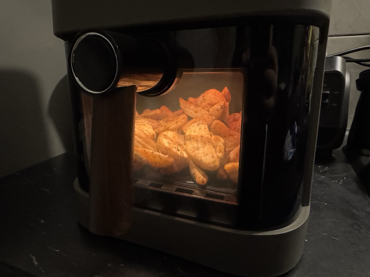 In der Praxis liefert die NF-CC500NXE überzeugende Ergebnisse. Sowohl Tiefkühlpommes als auch frische Kartoffelspalten gart die Heißluftfritteuse schön gleichmäßig. Das voreingestellte Automatikprogramm für Pommes verwendet eine Temperatur von 180 Grad und eine Garzeit von 20 Minuten, wobei die Dampffunktion automatisch aktiviert ist. Durch Erhöhen der Temperatur und Deaktivieren der Dampffunktion lässt sich ein noch knusprigeres Ergebnis erzielen. Auch die anderen von uns getesteten Funktionen und Zubereitungsvarianten wie beispielsweise Chicken Wings gefallen uns in der Praxis sehr gut. Aber auch hier zeigt sich, dass Nutzerinnen und Nutzer sich für mehr Knusprig- oder Saftigkeit entscheiden müssen.