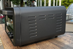 Mit Maßen von 48,9 Zentimetern in der Tiefe, 48,4 Zentimetern in der Breite und 33,1 Zentimetern in der Höhe bleibt der Ofen kompakt. Durch das Gewicht von 9,2 Kilogramm eignet er sich zwar nicht für häufiges Umstellen, lässt sich aber problemlos verstauen.