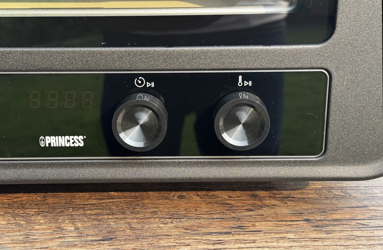 Zwei silberne Drehregler unter einem kleinen Display zeigen die einfache Steuerung von Zeit und Temperatur.