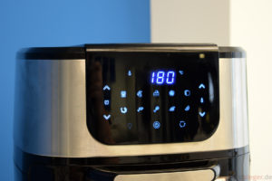 Die Bedienung hat uns im Test vor keine größeren Probleme gestellt. Über der Ofentür befindet sich die Bedienleiste mit insgesamt 17 berührungsempfindlichen Tasten. Diese reagieren allesamt zügig und zuverlässig. Über die Power-Taste lässt sich die Fritteuse aus dem Standby-Modus holen: Einen Schalter, um das Gerät komplett vom Strom zu trennen, suchen wir allerdings vergebens. Hier hilft nur Stecker ziehen. Sind alle Einstellungen getroffen, startet der Knopf dann auch die Zubereitung. Apropos Einstellung: Die Zubereitung lässt sich in Temperatur und Zeit variieren. Die Zeitspanne liegt zwischen einer und 60 Minuten und kann in Minutenschritten ausgewählt werden. Die Temperatur reicht von 65 bis 200 Grad Celsius, jeweils in Fünfer-Schritten einstellbar.