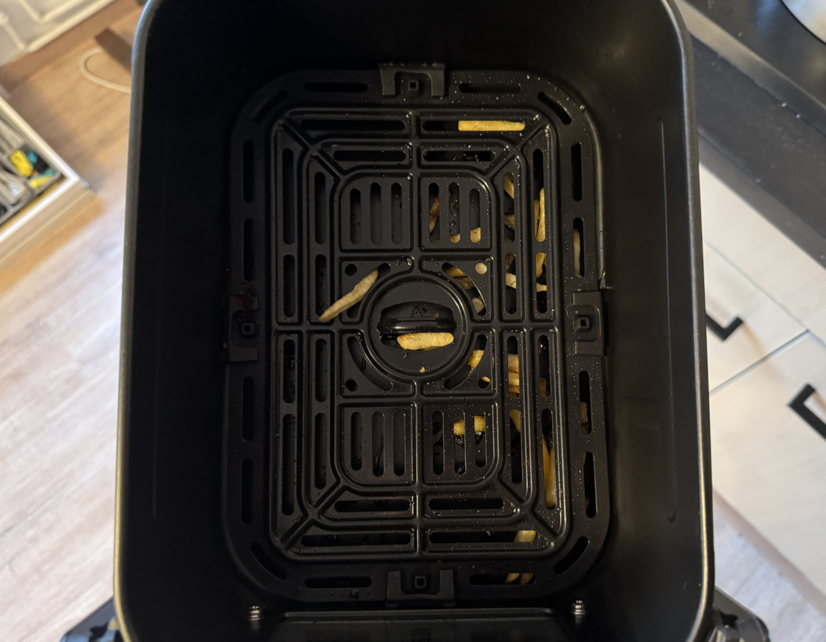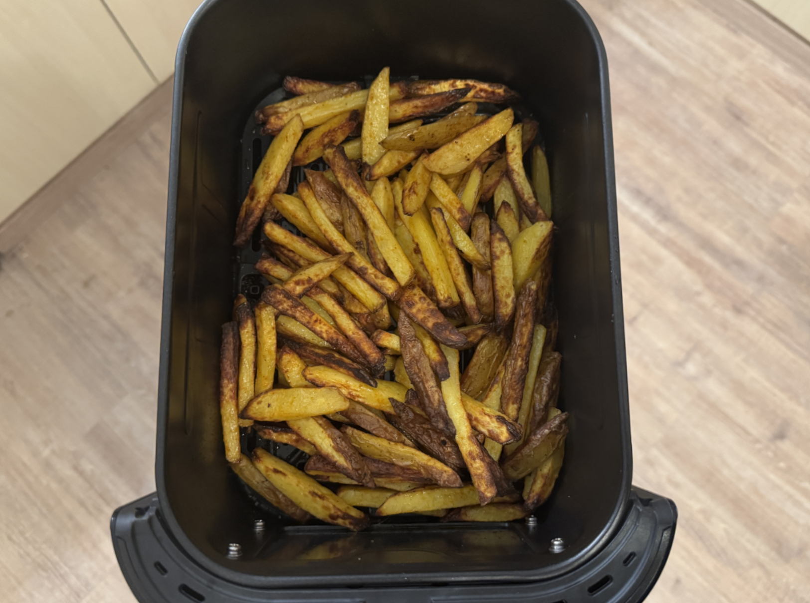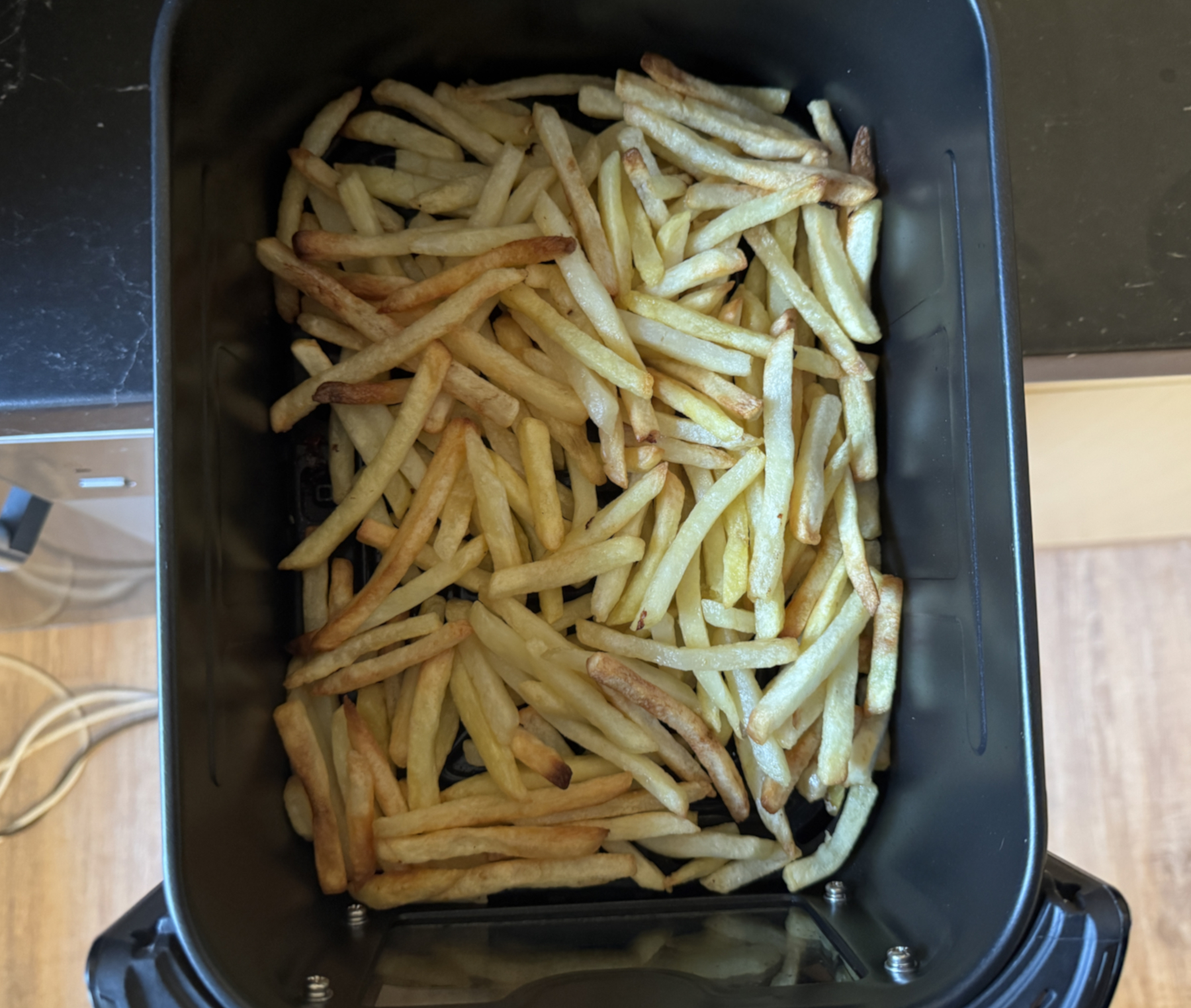 Mit einer Kapazität von fünf Litern eignet sich der Airfryer gut für Einzelpersonen oder kleine Haushalte. Die Zubereitungsqualität überzeugt größtenteils. Bei Tests mit Pommes frites und Kartoffelspalten wurden die Lebensmittel gleichmäßig gegart. Allerdings hat die Knusprigkeit noch Luft nach oben, selbst bei einer längeren Garzeit. Besonders auffällig: Dünne Pommes fallen teilweise durch die großen Löcher im Rost und werden somit nicht optimal gegart. Hier wäre eine verbesserte Konstruktion des Rosts wünschenswert.