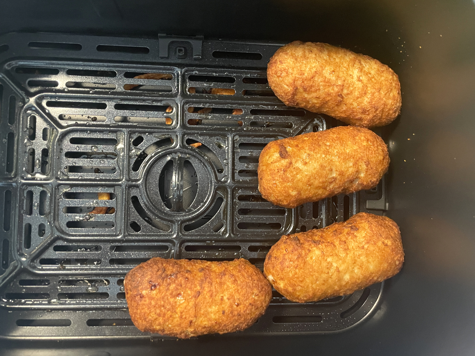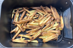 Unser erster Test beginnt mit Tiefkühlpommes, einer klassischen Aufgabe für Heißluftfritteusen. Wir wählen das voreingestellte Pommes-Programm und lassen die Fritteuse ihre Arbeit verrichten. Nach 20 Minuten soll alles fertig sein. Eine nette Überraschung: Nach etwa 12 Minuten erinnert uns ein akustisches Signal daran, die Pommes einmal durchzuschütteln. Diese Funktion ist äußerst praktisch, um eine gleichmäßige Bräunung zu gewährleisten. Die Ergebnisse sind überzeugend. Fast alle Pommes sind knusprig und gleichmäßig durchgegart, nur wenige Stücke am Boden des Garkorbs sind etwas weniger knusprig. Dennoch ist das Ergebnis insgesamt sehr zufriedenstellend.
