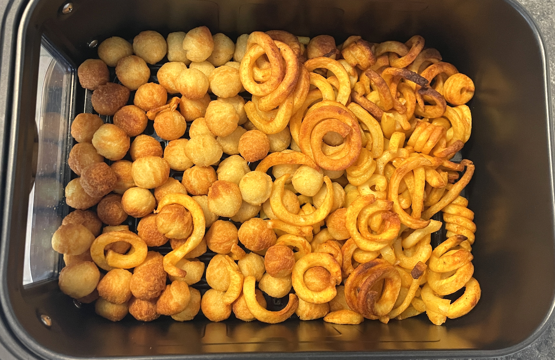 Unser erster Test beginnt mit Tiefkühlpommes, einer klassischen Aufgabe für Heißluftfritteusen. Wir wählen das voreingestellte Pommes-Programm und lassen die Fritteuse ihre Arbeit verrichten. Nach 20 Minuten soll alles fertig sein. Eine nette Überraschung: Nach etwa 12 Minuten erinnert uns ein akustisches Signal daran, die Pommes einmal durchzuschütteln. Diese Funktion ist äußerst praktisch, um eine gleichmäßige Bräunung zu gewährleisten. Die Ergebnisse sind überzeugend. Fast alle Pommes sind knusprig und gleichmäßig durchgegart, nur wenige Stücke am Boden des Garkorbs sind etwas weniger knusprig. Dennoch ist das Ergebnis insgesamt sehr zufriedenstellend.