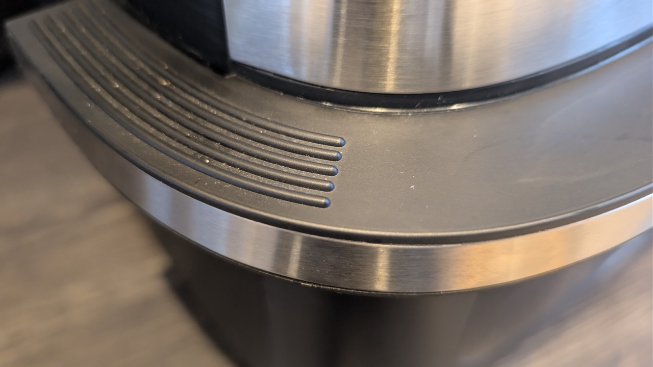 Die Verarbeitungsqualität fällt im Praxiseinsatz positiv auf. Die Seitenwände wirken robust und lassen sich nur wenig eindrücken. Produktionsrückstände sind kaum vorhanden, die Spaltmaße recht gleichmäßig. Scharfe Kanten finden wir nicht. Der antihaftbeschichtete Frittierkorb im Inneren macht ebenfalls einen robusten Eindruck. Hinzu kommen rutschfeste Füße, die dem relativ voluminösen Gerät einen stabilen Stand auf der Arbeitsplatte geben.