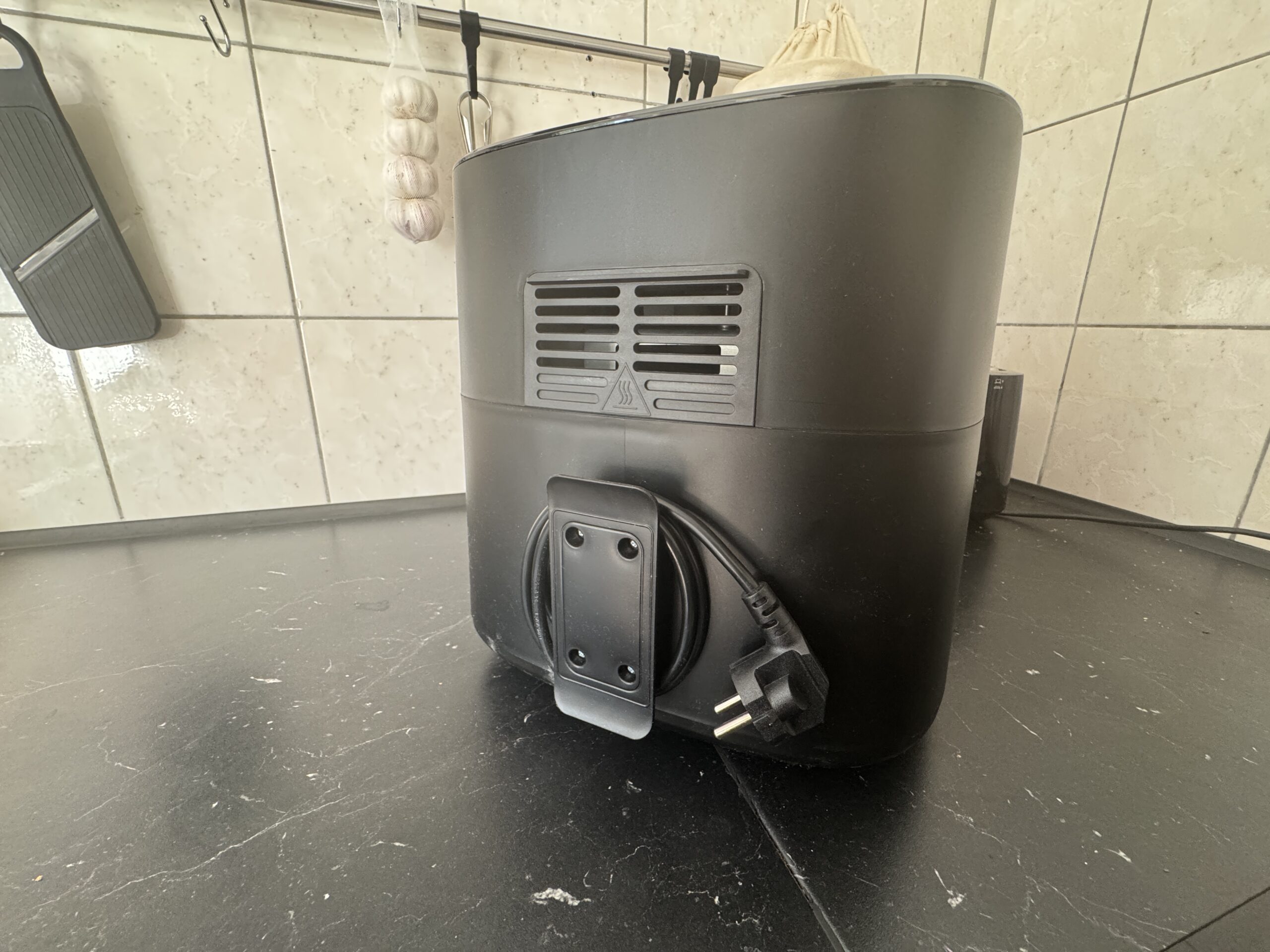 Erfreulich ist, dass kein Dampf austritt und die Luftzirkulation kontrolliert erfolgt. Das Kabel misst etwa 80 Zentimeter und lässt sich an der Rückseite des Geräts ordentlich verstauen – ein kleines, aber praktisches Detail.