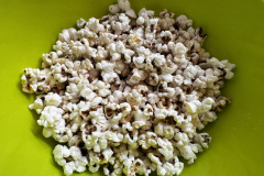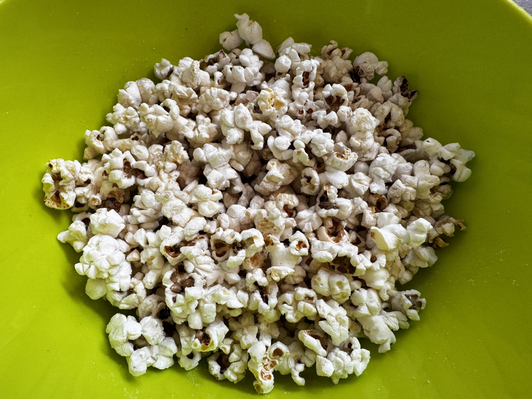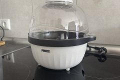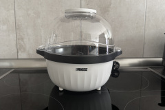 Die Popcorn-Zubereitung dauert mit sieben Minuten etwas länger als bei Geräten mit höherer Leistung, was sich durch die eher schwache Heizleistung von 450 Watt erklären lässt. Dennoch überzeugt das Ergebnis: Die Maiskörner ploppen zuverlässig auf, das Popcorn ist schön luftig und gleichmäßig gegart. Danach können wir nach Wahl Zucker und/oder Salz zugeben. Zwar nicht so gebräunt wie in einem Kino, aber für selbstgemachtes Popcorn wirklich sehr schmackhaft.