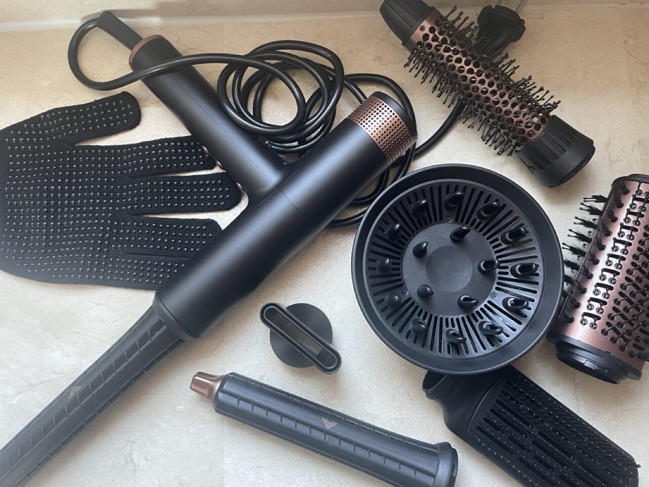 Ein echtes Highlight ist die umfangreiche Ausstattung. Im Lieferumfang befinden sich gleich 7 verschiedene Aufsätze: eine klassische Düse, ein Diffusor, eine Rundbürste, eine Ovalbürste, eine Glättbürste sowie zwei selbstaufrollende Lockenstäbe (je einer für die rechte und linke Seite). Jeder dieser Aufsätze erfüllte eine klare Funktion und bringt individuelle Styling-Möglichkeiten mit sich.