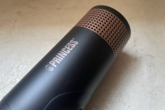 Bereits beim Auspacken macht der Princess einen hochwertigen Eindruck. Der Airstyler wirkt stabil, gut verarbeitet und liegt angenehm in der Hand. Die verwendeten Materialien machen einen robusten, langlebigen Eindruck – und erfreulicherweise heizt sich das Gehäuse auch bei längerer Nutzung nicht auf. Lediglich die Aufsätze erwärmen sich, was aber im Rahmen der Erwartungen liegt. Dank des mitgelieferten Hitzeschutzhandschuhs können wir diese dennoch problemlos wechseln – Verbrennungsgefahr besteht dabei nicht. Besondere Schwächen bei der Verarbeitung können wir nicht entdecken: Alles sitzt fest an seinem Platz, es wackelte nichts, und auch klappernde Geräusche sind nicht zu hören.