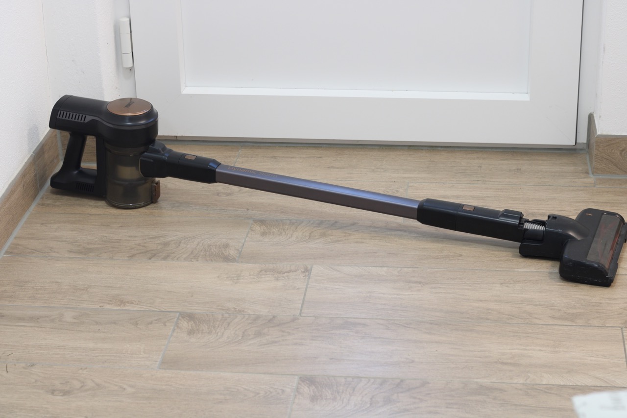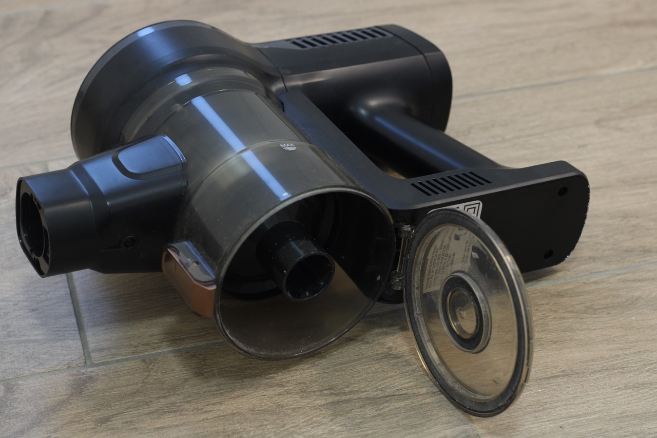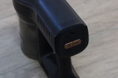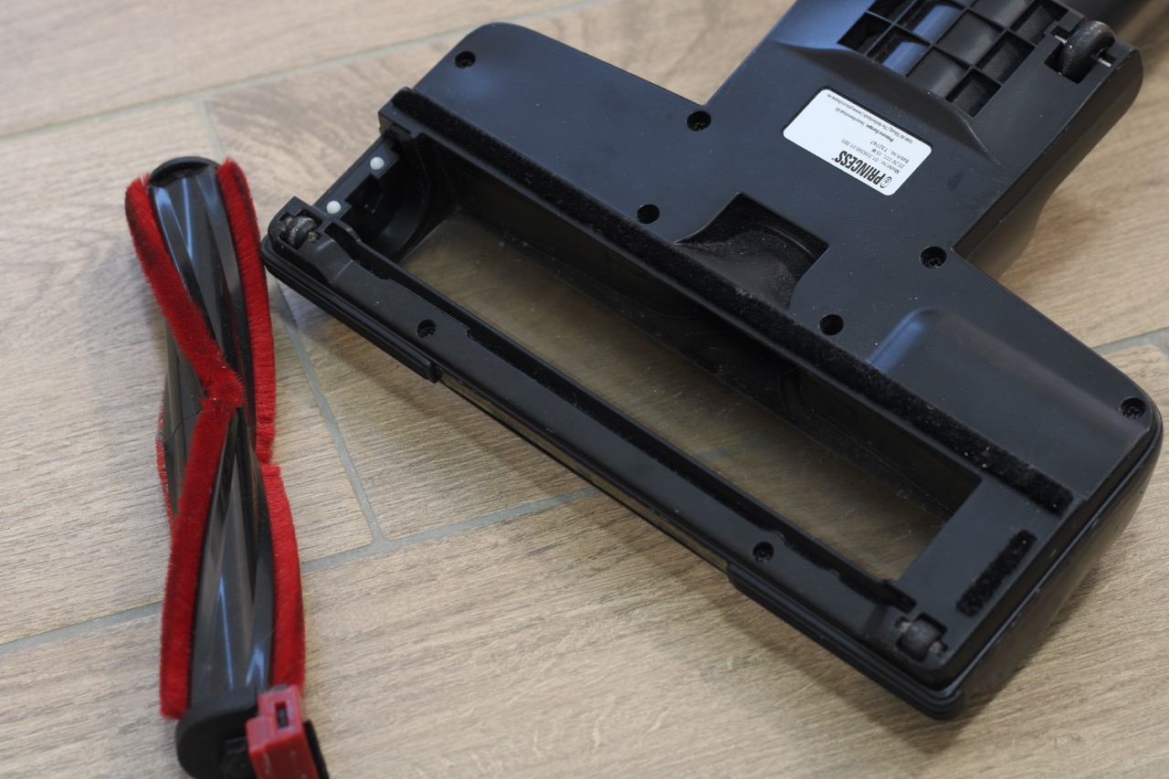 Der Princess Dynamic Storm verfügt über einen Feinstaubfilter der Klasse F9. Das bedeutet, dass die Abluft zwar von einem Großteil der Partikel befreit, aber nicht komplett rein ist. Vor allem Allergiker und Allergikerinnen sollten das bei ihrer Kaufentscheidung berücksichtigen. Den 0,6-Liter-Staubbehälter entleeren wir über einen Schieberegler am Handteil. Dann öffnet sich die Klappe auf der Unterseite und der Schmutz fällt heraus – ein einfaches, aber effektives System. Allerdings fällt in aufgestellter Position vor allem größerer Schmutz gerne aus dem Behälter durch das Rohr wieder heraus. Das ist nervig, wenn wir jedoch darauf achten, das Einrastgelenk an der Düse zu lösen, können wir gut damit umgehen.