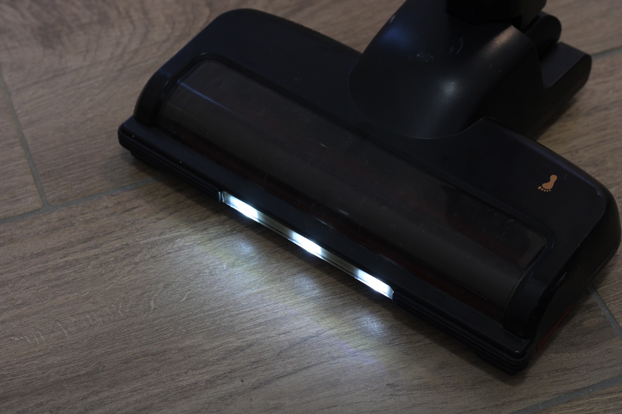 Das Saugen gefällt uns gut, was vor allem am niedrigen Gewicht liegt. Selbst nach längeren Einsätzen stellen wir keine Ermüdungserscheinungen fest. Im Zweifel lässt sich der Dynamic Storm auch für das Saugen an der Decke verwenden. Die Gleiteigenschaften der Düse gefallen uns ebenfalls. Für eine bessere Flexibilität können wir die Düse um circa 90 Grad nach links und rechts drehen. Das ist nichts Außergewöhnliches, hilft aber in der Praxis. Um den Schmutz auch in dunklen Ecken sichtbar zu machen, spendiert Princess dem Akkustaubsauger 3 LEDs an der Düse. Diese sind hell genug und bieten in der Praxis einen echten Mehrwert. Nach dem Saugen können wir das Gelenk an der Düse fest einrasten. Dann steht der Dynamic Storm von allein, was enorm beim Parken hilft. Wer möchte, kann auch die beiliegende Halterung mit den enthaltenen Schrauben an der Wand befestigen.