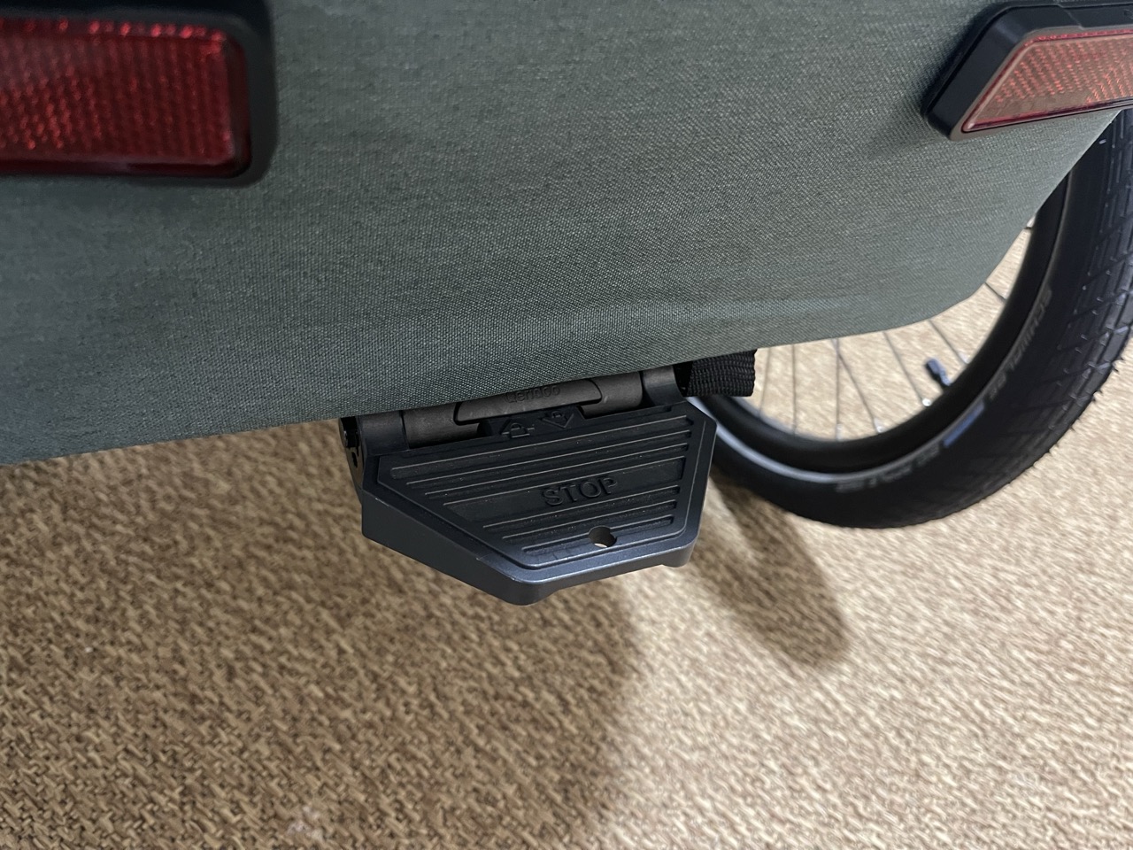 Die Parkbremse hält auch an leichter Schräge zuverlässig – ein im Alltag unterschätztes, aber wichtiges Detail. Die Sichtbarkeit im Straßenverkehr ist vorbildlich: Rücklicht, Reflektoren hinten und seitlich, reflektierende Streifen auf Rädern, Bezug und Verdeck sowie ein Wimpel sorgen dafür, dass der Anhänger auch in der Dämmerung gut wahrgenommen wird. Die Normen EN 15918:2011+A2:2017 und EN 1888-1:2018+A1:2022 berücksichtigt Qeridoo ebenfalls. Das Material ist schadstoffgeprüft und hinterlässt im Test keine auffälligen Gerüche oder Irritationen.