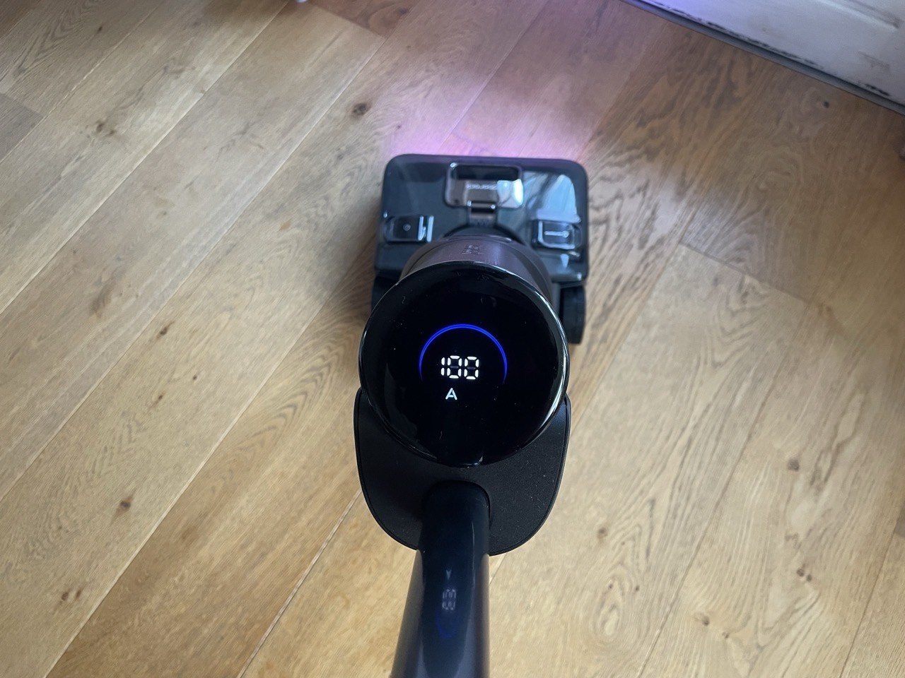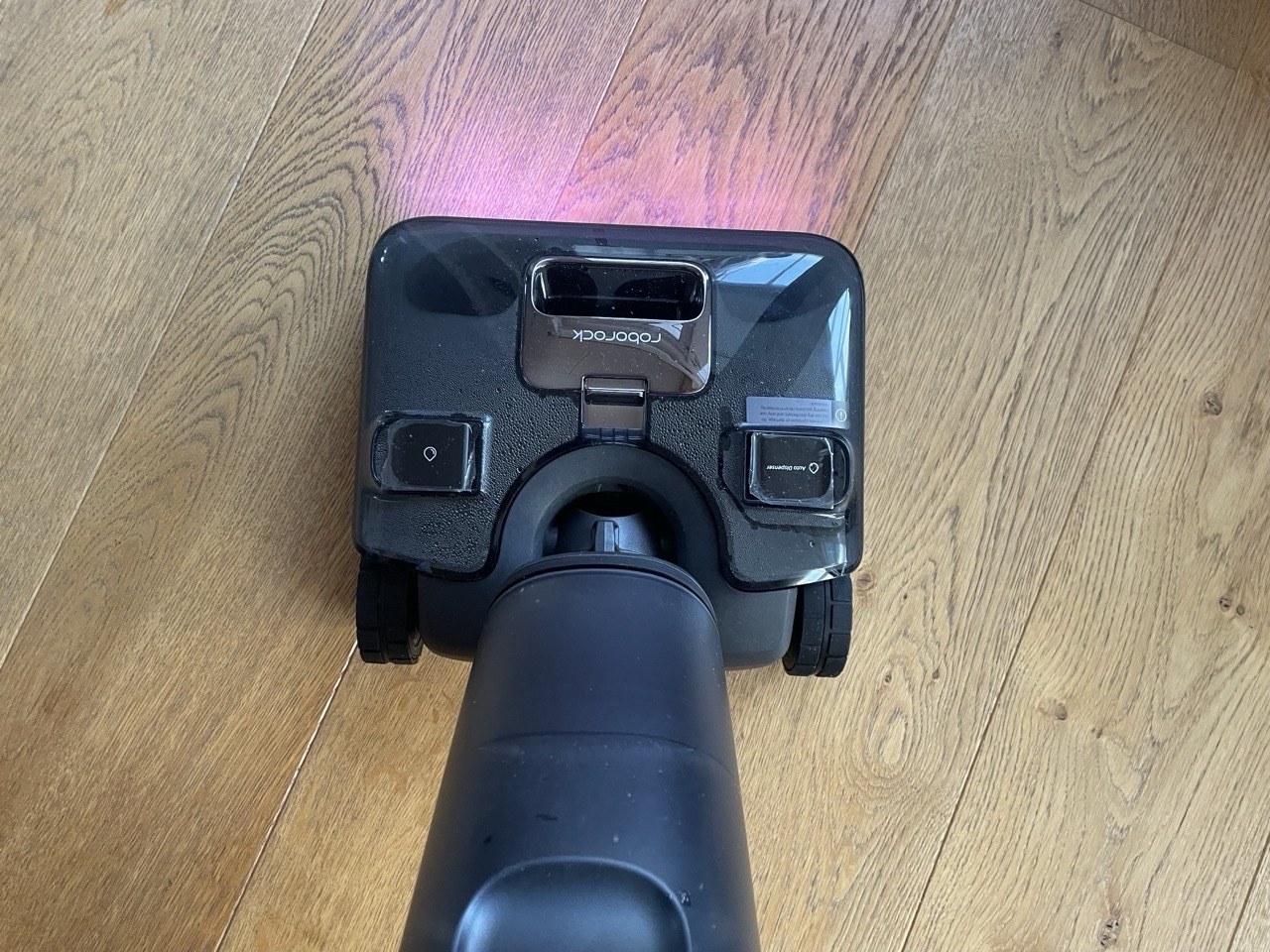 Alle Programme des F25 Ultra arbeiten nach dem Prinzip „nass, trocken, sauber“. Das bedeutet, dass der Sauger immer Feuchtigkeit verwendet, während er gleichzeitig Trockenpartikel wie Krümel, Staub, Haare oder Federn zuverlässig aufnimmt. Einen separaten reinen Trockensaugmodus ohne Wasserzufuhr gibt es nicht. Das Frontlicht mit leicht violettem Farbstich erleichtert die Sichtbarkeit von Staub und Schmutz, besonders in dunkleren Ecken oder bei ungünstigem Lichteinfall. Der motorunterstützte Antrieb reduziert den Kraftaufwand beim Schieben deutlich. Vor- und Rückwärtsbewegungen gelingen mühelos, größere Flächen lassen sich komfortabel bearbeiten, während die Wendigkeit in sehr engen Räumen leicht eingeschränkt ist. Über die App lassen sich Wasserstand, Reinigungsmitteldosierung und Reinigungsmodi intuitiv steuern.