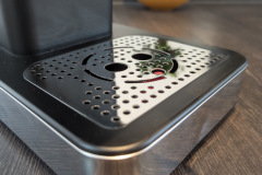 Optisch macht die Russell Hobbs einiges her. Das Gehäuse mit den polierten Akzenten wirkt auf den ersten Blick edel und modern. Wir testen die schwarze Variante (26450-56), zudem sind die Farbvarianten Ocean Blue (26451-56) und Titanium (26452-56) erhältlich. Allerdings zeigen sich im Detail ein paar Schwächen. Auf der Oberfläche sammeln sich schnell Fingerabdrücke und die Materialwahl ist nicht durchgehend hochwertig. Das Gehäuse besteht aus einer Mischung aus Edelstahl und Kunststoff, wobei sich die Seitenwände recht leicht eindrücken lassen. Besonders ärgerlich: Im Test entdecken wir eine Delle in der Blende der Tropfschale – das darf bei einer neuen Maschine nicht passieren.