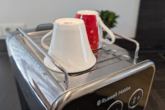 Als kleine Zusatzfunktion bringt die Maschine einen passiven Tassenwärmer auf der Oberseite mit. Bis zu vier Espressotassen finden hier Platz – eine nette Dreingabe, wenn auch keine, die den Ausschlag beim Kauf geben dürfte. Ein Kritikpunkt ist dagegen der Siebträger: Das Einsetzen erfordert Übung und das Drehen teilweise viel Kraft. Wer sich morgens auf einen schnellen Espresso freut, muss hier erstmal etwas Geduld mitbringen.