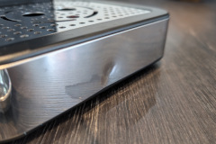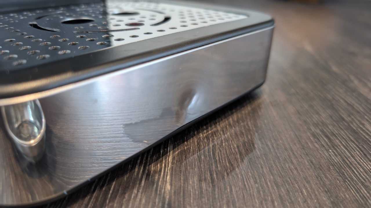 Optisch macht die Russell Hobbs einiges her. Das Gehäuse mit den polierten Akzenten wirkt auf den ersten Blick edel und modern. Wir testen die schwarze Variante (26450-56), zudem sind die Farbvarianten Ocean Blue (26451-56) und Titanium (26452-56) erhältlich. Allerdings zeigen sich im Detail ein paar Schwächen. Auf der Oberfläche sammeln sich schnell Fingerabdrücke und die Materialwahl ist nicht durchgehend hochwertig. Das Gehäuse besteht aus einer Mischung aus Edelstahl und Kunststoff, wobei sich die Seitenwände recht leicht eindrücken lassen. Besonders ärgerlich: Im Test entdecken wir eine Delle in der Blende der Tropfschale – das darf bei einer neuen Maschine nicht passieren.