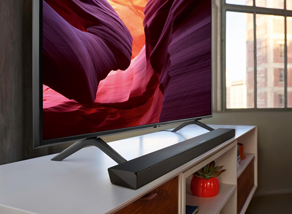 Besonders in Zusammenspiel mit der Acoustic-Beam-Technologie entfalten die Geräte ihr volles Potential. Die Technologie bedient sich einer Anordnung von Schallaustrittsöffnungen, die an der Oberseite der Soundbar verortet sind. Je nach eingehendem Signal wird der Schall der Hochtöner in verschiedene Richtungen ausgestrahlt. So kann sich der Klang dem Geschehen auf dem Bild anpassen und es entsteht eine dynamische Klanglandschaft im Raum.