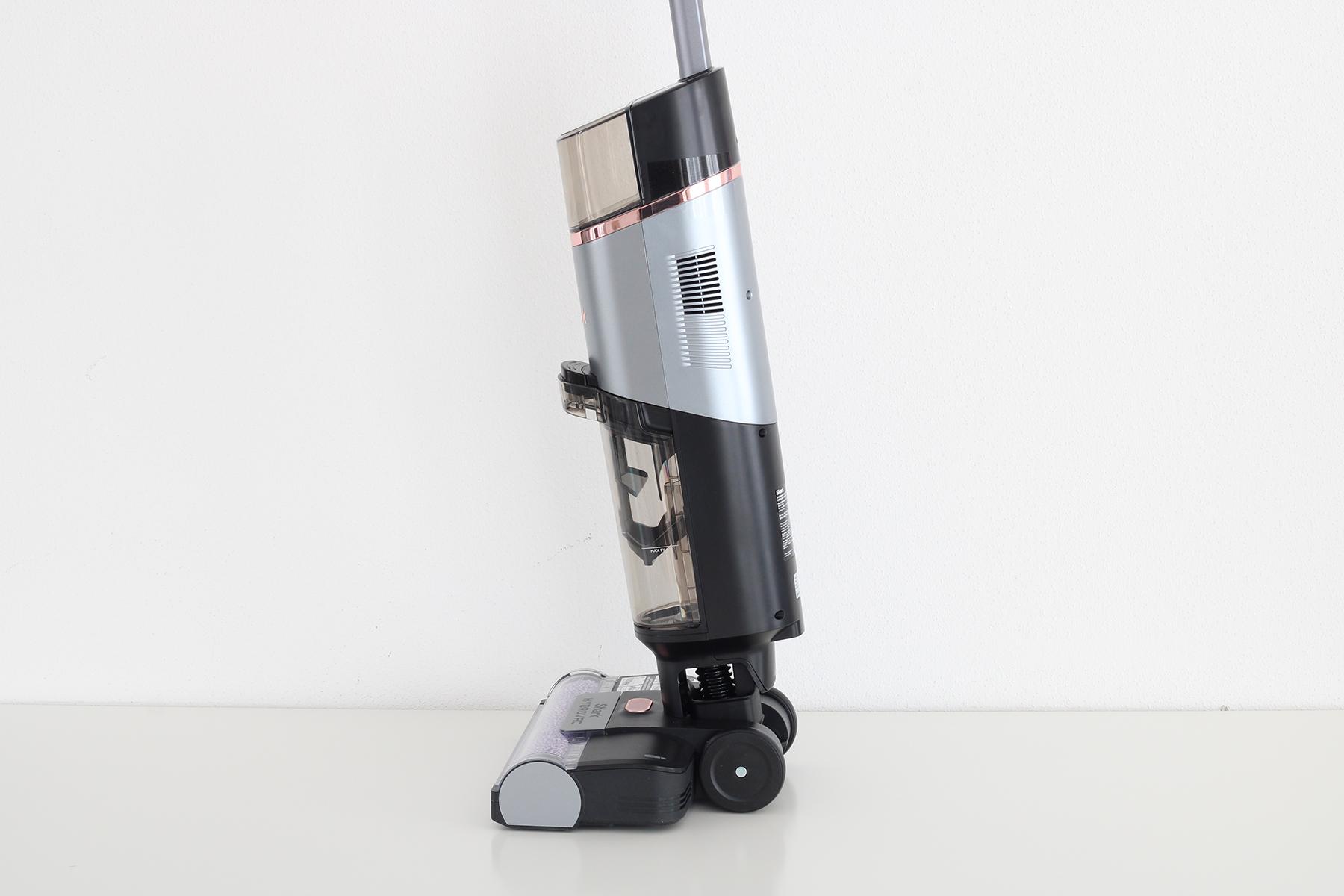 Dafür verfügt der HydroVac über LEDS an der Bodendüse. Diese sind gerade bei schlechtem Licht sehr hilfreich. Nach dem Saugen können wir das Gelenk fest einrasten und der Sauger steht wie eine Eins – sehr praktisch. Wir können ihn aber auch in der beiliegenden Ladestation parken.