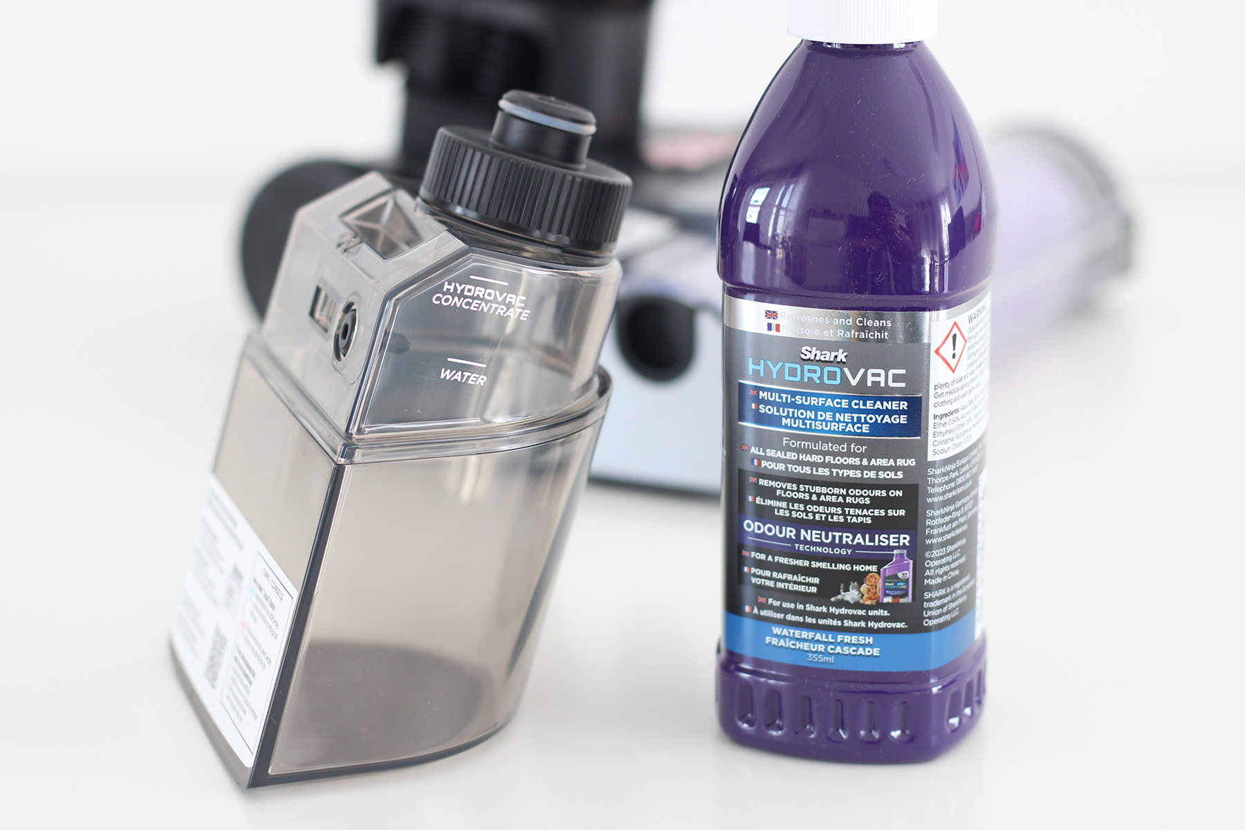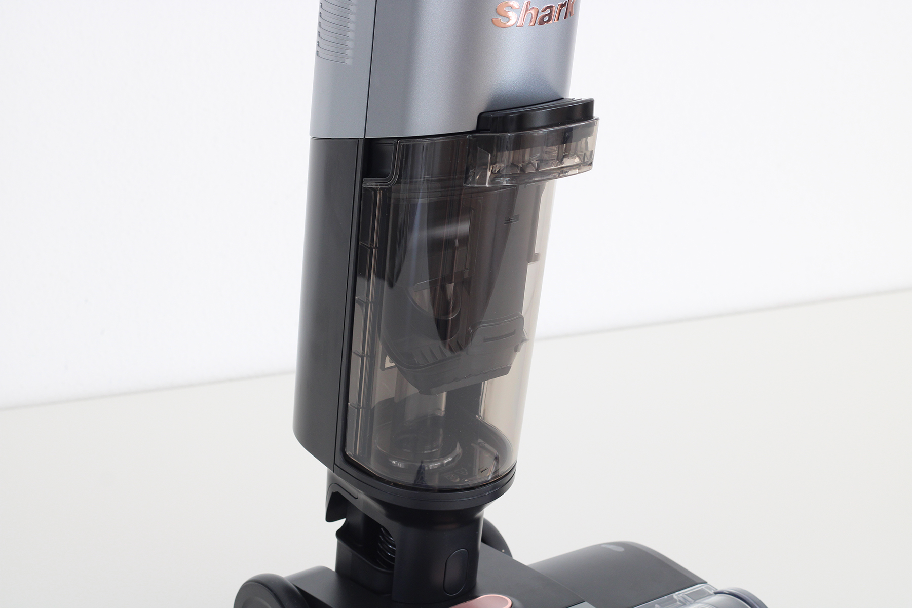 Die beiden Tanks lassen sich sehr leicht einsetzen und wieder entnehmen. Der Frischwassertank fasst 500 Milliliter. Wer möchte, kann noch eine spezielle Reinigungsflüssigkeit gegen Gerüche auf Hartböden hinzufügen, die den Boden laut Shark auch desinfizieren soll. Eine 355-Milliliter-Flasche befindet sich bereits im Lieferumfang. Eine 1-Liter-Flasche kostet bei Shark 14,99 Euro. Dank gut sichtbarer Markierungen wissen wir immer, wie viel Wasser und Reiniger wir einfüllen müssen. Der Schmutzwassertank hat ein Volumen von 360 Millilitern. Das hätte aus unserer Sicht gerne noch etwas mehr sein dürfen. Das Schmutzwasser können wir über eine kleine Öffnung abgießen. Danach entfernen wir den Feinstaubfilter und die Vorrichtung für festen Schmutz. Ein durchdachtes System, das in der Praxis sehr gut funktioniert.