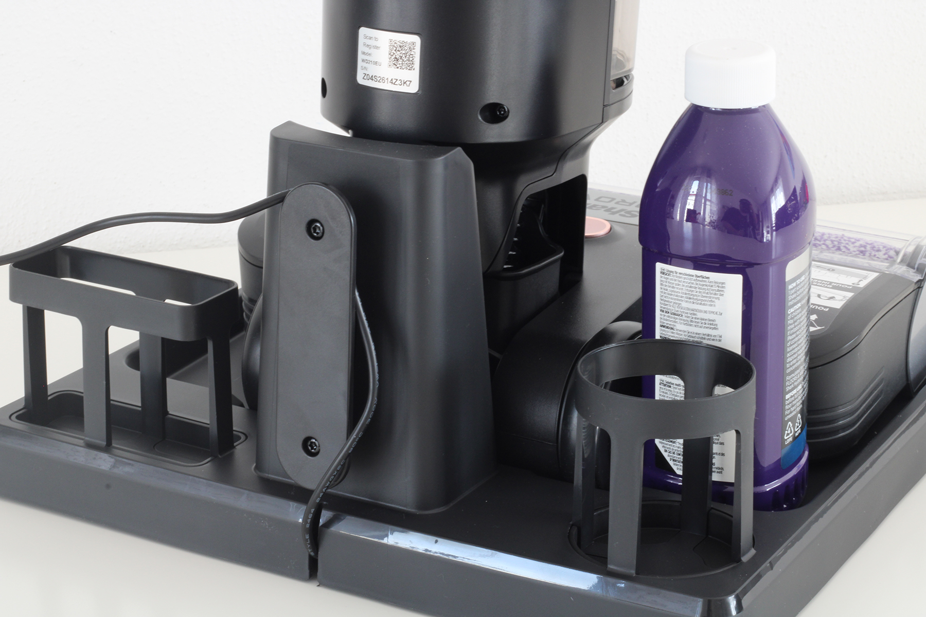 Die Hygiene des Shark HydroVac ist ein zweischneidiges Schwert. Wie bereits erwähnt, kommen wir mit der Entleerung des Schmutzwassertanks gut zurecht. Zunächst schütten wir das Wasser ab, dann klopfen wir den groben Schmutz vom Filter ab und waschen diesen gründlich aus. Anders sieht es bei der Düse aus. Abdeckung und Rollen lassen sich leicht entnehmen, allerdings bleibt viel Schmutz zurück, den wir per Hand entfernen müssen. Da die Düse nicht abnehmbar ist, müssen wir dazu mit dem kompletten Staubsauger hantieren, was die Arbeit erschwert. Der HydroVac verfügt über einen Selbstreinigungsmodus, der nach jeder Verwendung einmal durchlaufen sollte. Dazu stellen wir den Sauger in die Ladestation und betätigen die Power-Taste. Der Zyklus ist mit circa 2:30 Minuten recht schnell, allerdings entsteht im Anschluss eine Dreckwasserpfütze in der Ladestation, die wir aufwischen müssen – nicht schön. Zum Trocken verfügt die Ladestation über Halterungen für die Rolle und die Abdeckung. Darüber schweigt sich die Anleitung jedoch aus und es dauert etwas, bis wir es uns selbst erschließen.