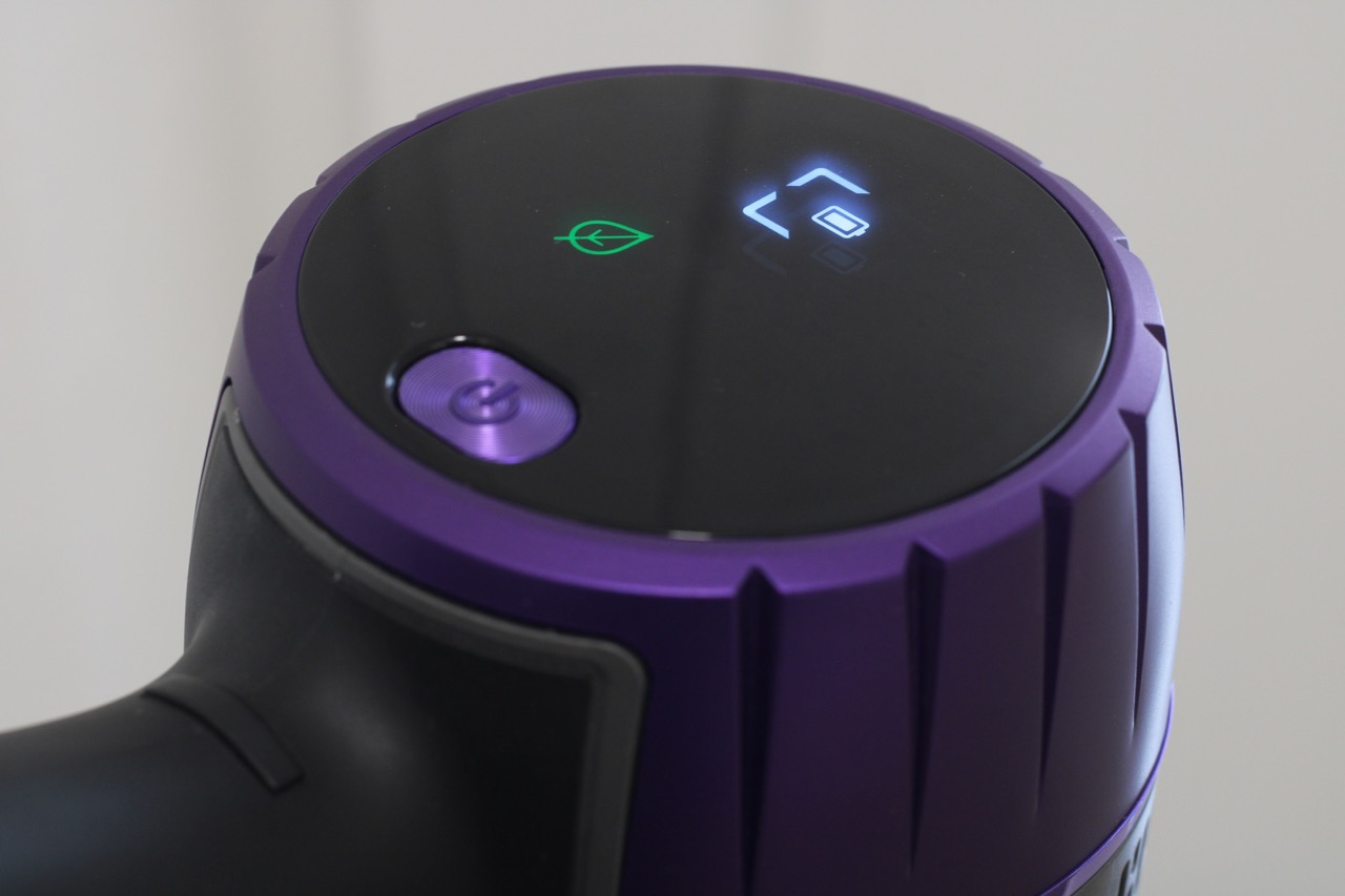 Die Bedienung des Shark PowerDetect ist unkompliziert, da nur zwei Tasten zum Einsatz kommen. Unterhalb des Displays an der Motoreinheit befindet sich der Power-Button zum Ein- und Ausschalten. Am Haltegriff ist ein Zugknopf integriert, mit dem wir zwischen den drei Saugmodi wechseln.