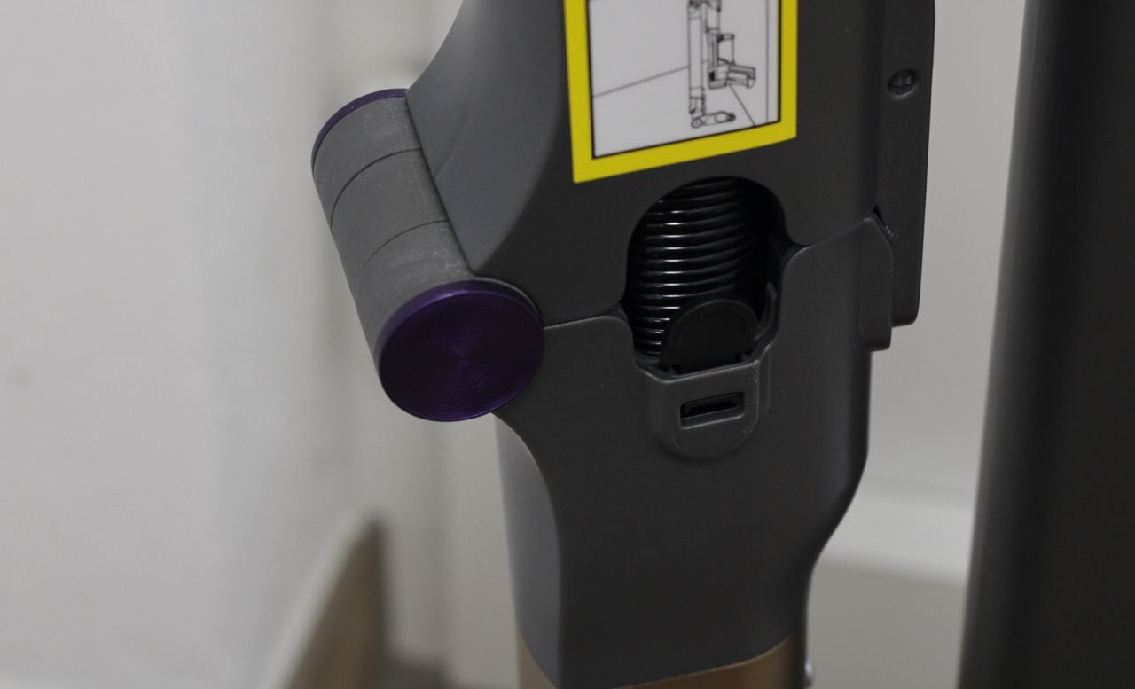 Praktisch ist die Parkfunktion: Lösen Nutzerinnen und Nutzer die Verriegelung, können sie die Motoreinheit nach hinten Richtung Boden knicken. So ist der Staubsauger kompakt zusammengeklappt und kann sicher abgestellt werden.