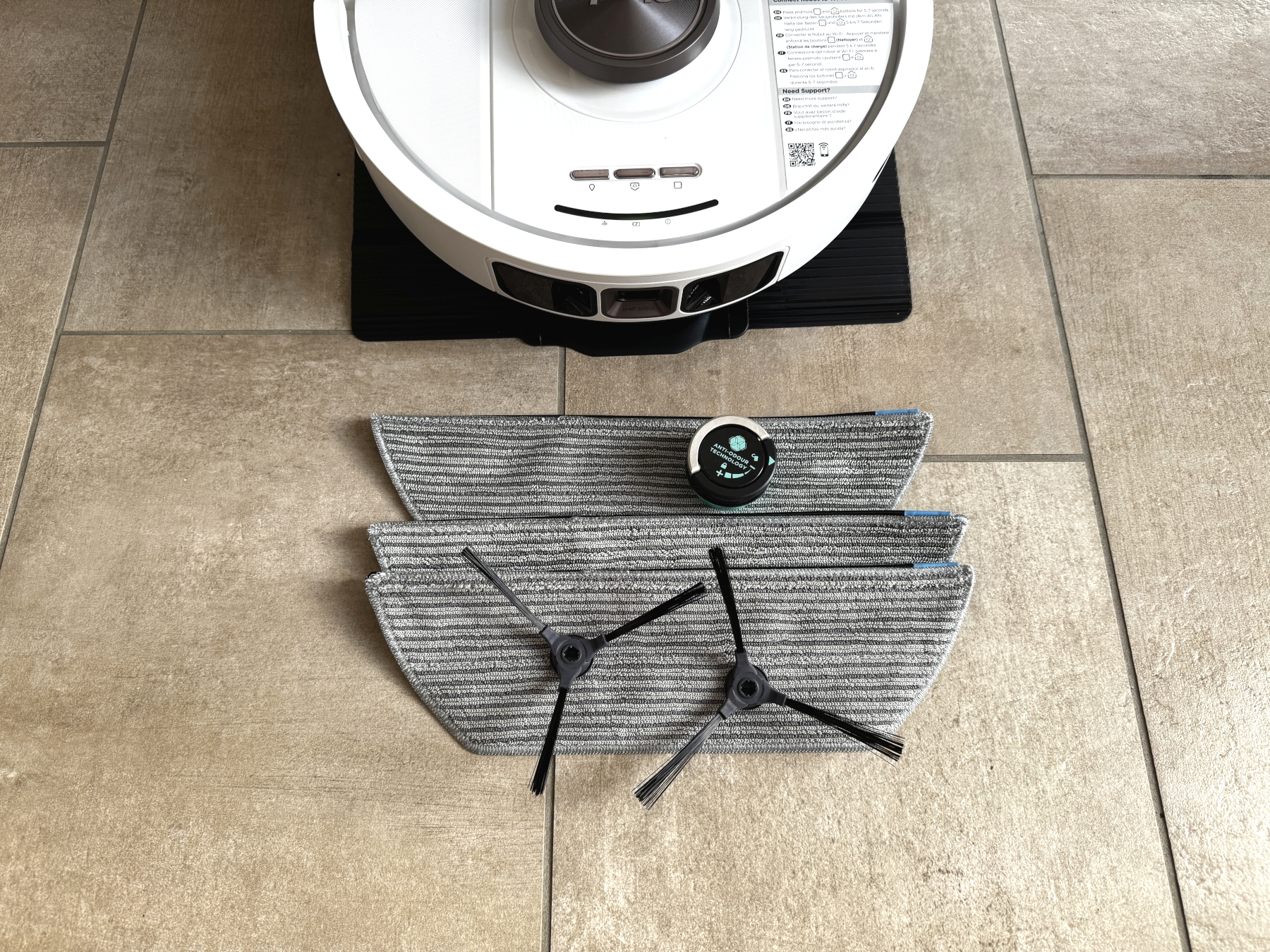Der Lieferumfang ist ordentlich: Neben zwei Seitenbürsten sind drei Wischpads enthalten – das reicht für den Start vollkommen aus.