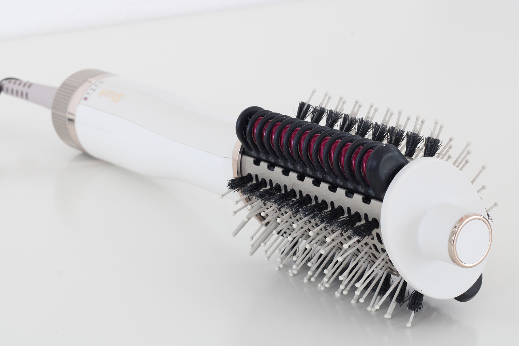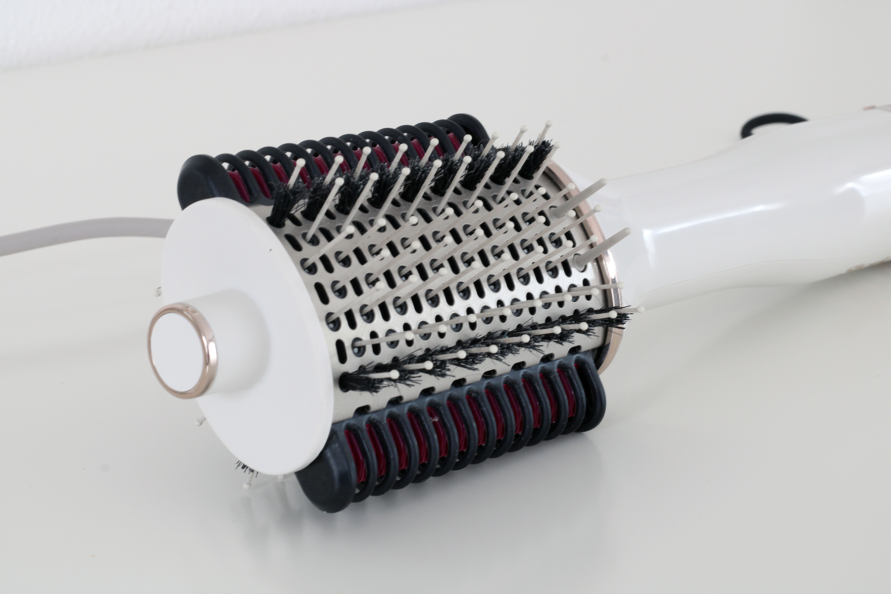 Im Nasshaar-Modus trocknet das Gerät die Haare effektiv und verleiht ihnen ein schönes Volumen ohne statische Aufladung. Allerdings kratzen die Borsten bei der Anwendung am Haaransatz etwas, was jedoch je nach Person und Hauttyp unterschiedlich wahrgenommen werden kann. Locken lassen sich nur bei sehr langen Haaren formen, da die Bürste mit 9,5 Zentimetern an der breitesten Stelle recht ausladend ist. Der Trockenhaar-Modus gefällt uns insgesamt ebenfalls gut. Die Keramikplatten glätten das Haar und beugen Frizz vor. Zudem haben die Haare danach einen schönen Glanz.