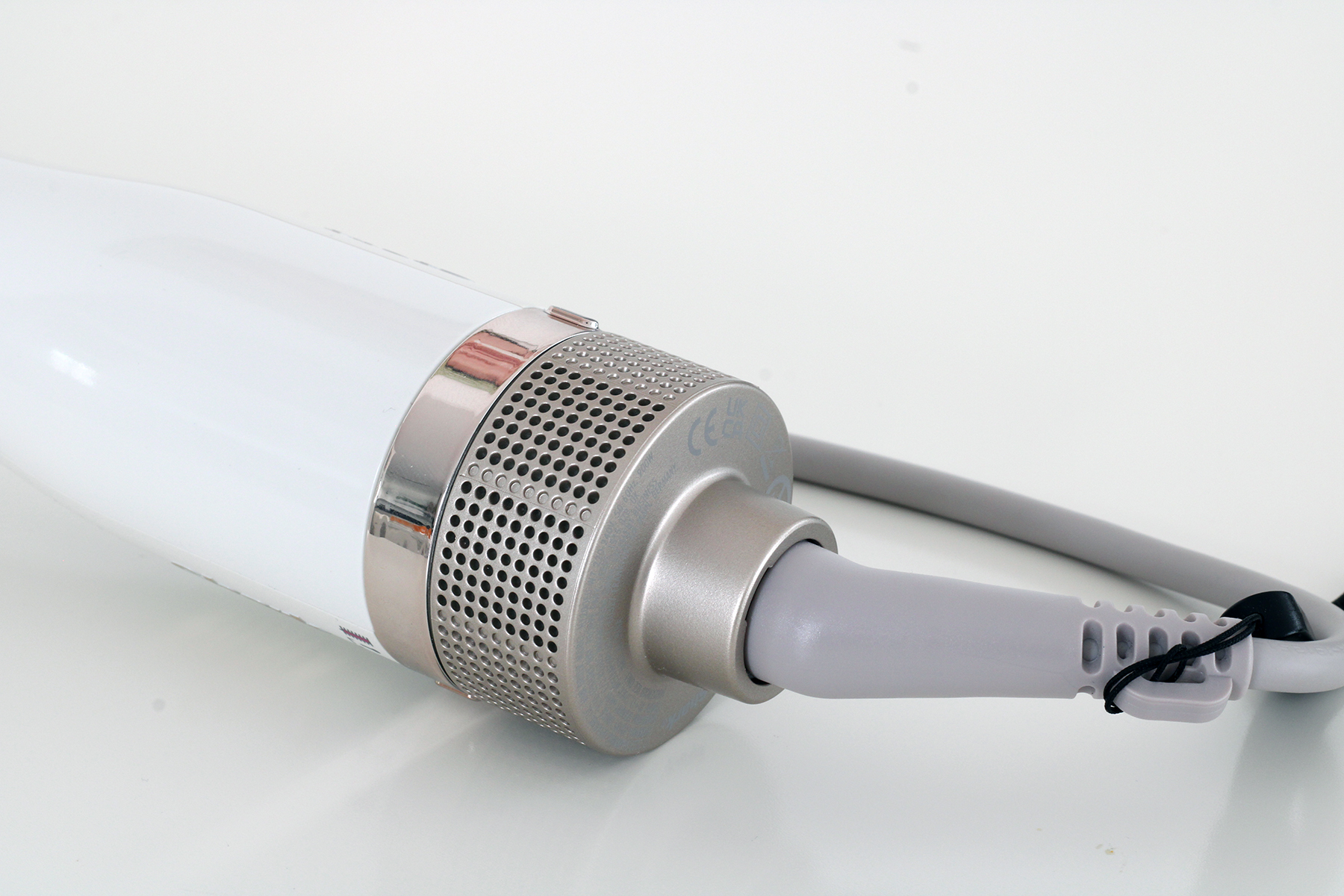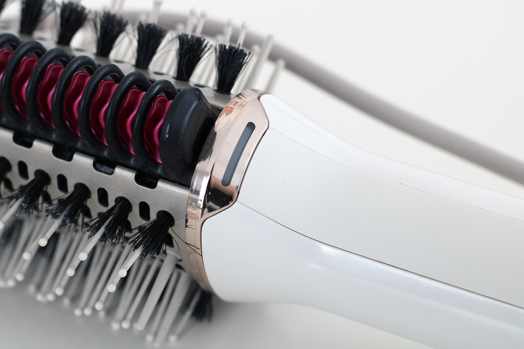 Das Gerät ist mit 8,3 x 35,5 x 9,5 Zentimetern (Breite x Länge x Höhe) recht groß, was für uns in der Praxis aber kein Problem ist. Uns stört eher das satte Gewicht von 730 Gramm. Gerade bei längeren Styling-Sessions kann das zu Ermüdungen führen. Ein kleiner Haltegriff oberhalb der Bürste, der sich nicht erwärmt, bietet jedoch eine gewisse Entlastung. Das Kabel lässt sich frei drehen, was Kabelbrüche effektiv verhindert.