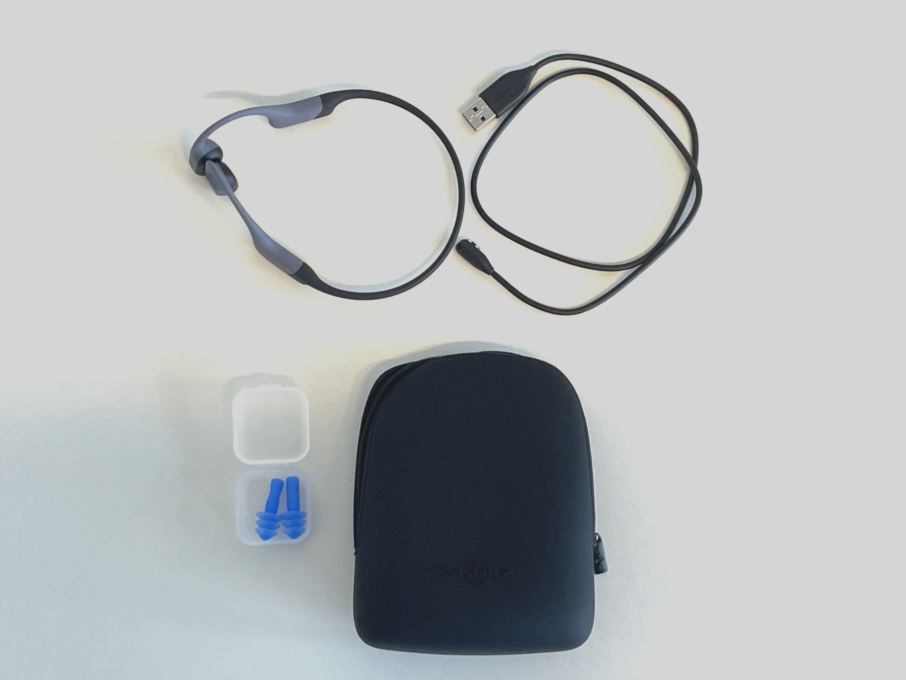 Die Akkulaufzeit beträgt über Bluetooth bei mittlerer Lautstärke etwa 8 Stunden – sehr gut. Nutzen wir den Speicher innerhalb der Kopfhörer, sind es immerhin noch 5 Stunden. Insgesamt gute Werte, die für jede Sportsession ausreichen sollten. Im Lieferumfang befindet sich lediglich ein Schutzcase, laden können wir die OpenSwim Pro darüber aber nicht. Dies geht nur über das beigelegte USB-Kabel. Eine komplette Aufladung erfolgt in anderthalb Stunden. Nicht besonders schnell, aber in der Praxis durchaus ausreichend.