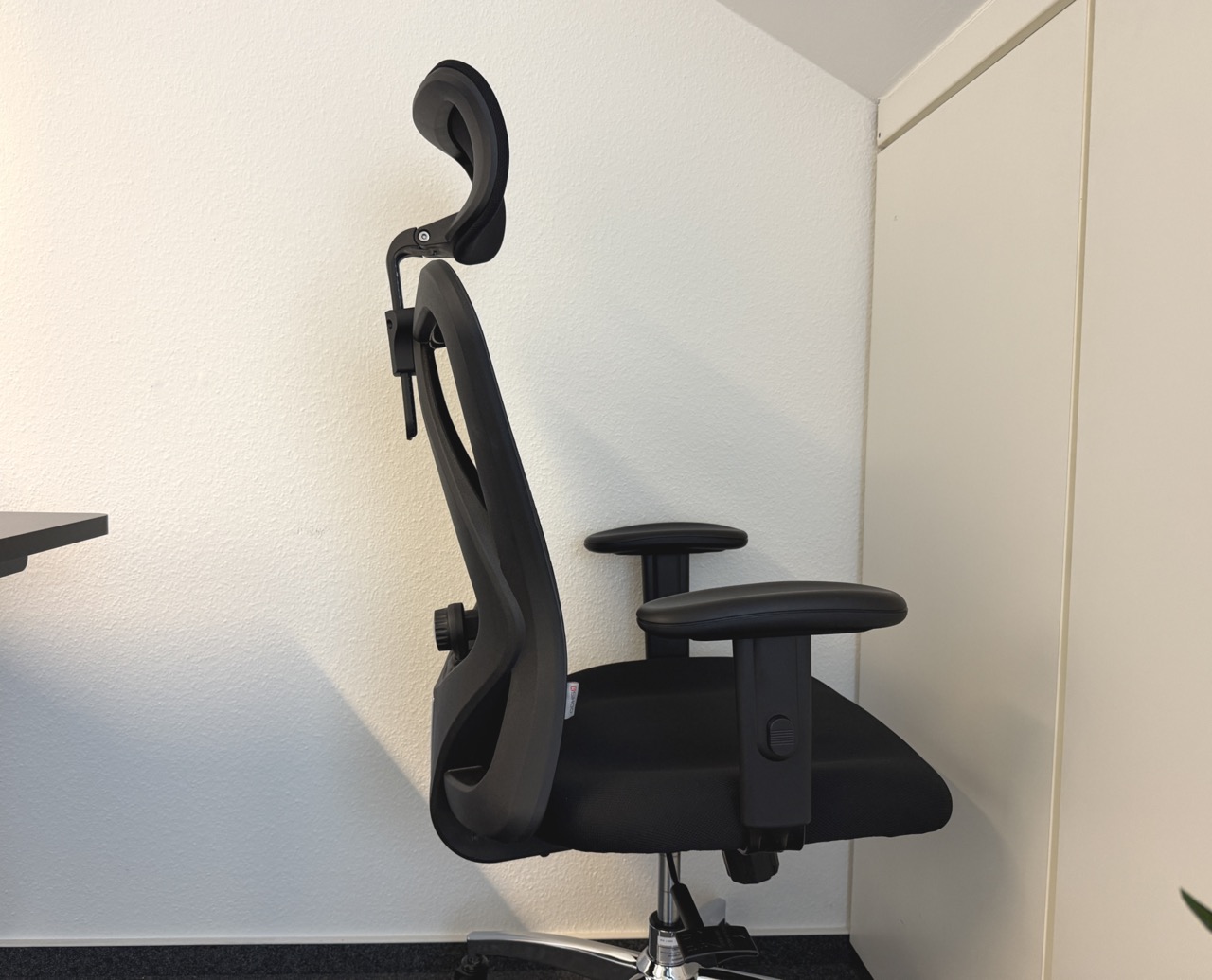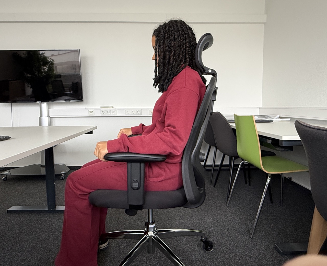 Die Armlehnen überzeugen dagegen auf ganzer Linie: Sie passen sich der natürlichen Armhaltung gut an und bieten eine bequeme Kuhle, in der die Unterarme entspannt ruhen. Weniger überzeugend zeigt sich die Kopfstütze. Sie ist in ihrer Form nur eingeschränkt anpassbar und unterstützt den Kopf nicht optimal. Zwar lässt sie sich neigen und in der Höhe verändern, dennoch fehlt ihr die Flexibilität, um sich verschiedenen Körperhaltungen exakt anzupassen.
