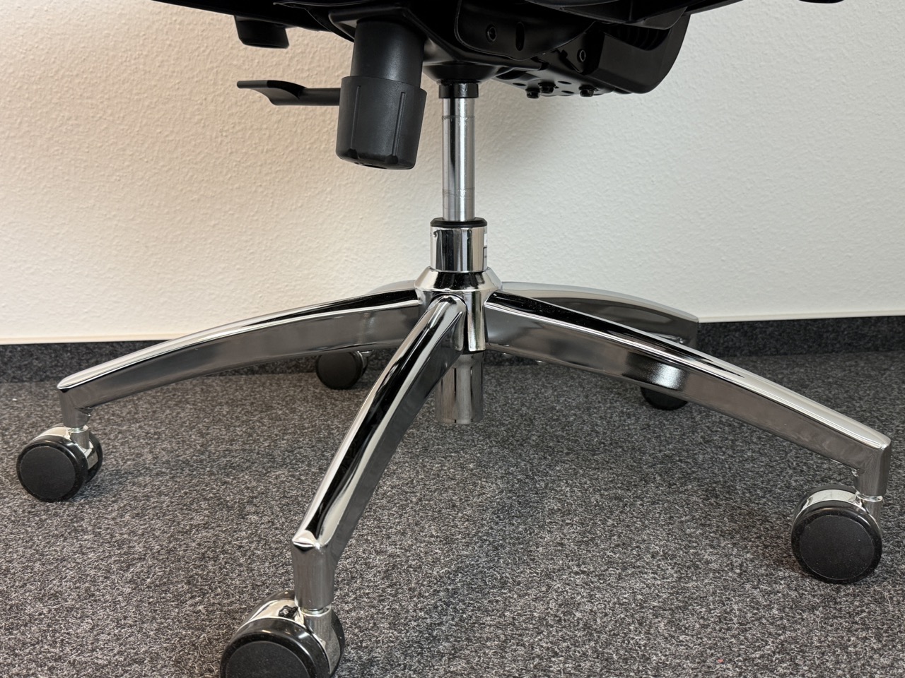 Der M57 steht sehr stabil. Wir lehnen uns zurück, wippen oder bewegen uns seitlich – der Stuhl bleibt sicher stehen. Das fünfarmige Aluminium-Fußkreuz sorgt für einen tiefen Schwerpunkt und verhindert ein Kippen. Selbst bei stärkerem Zurücklehnen wackelt nichts.
