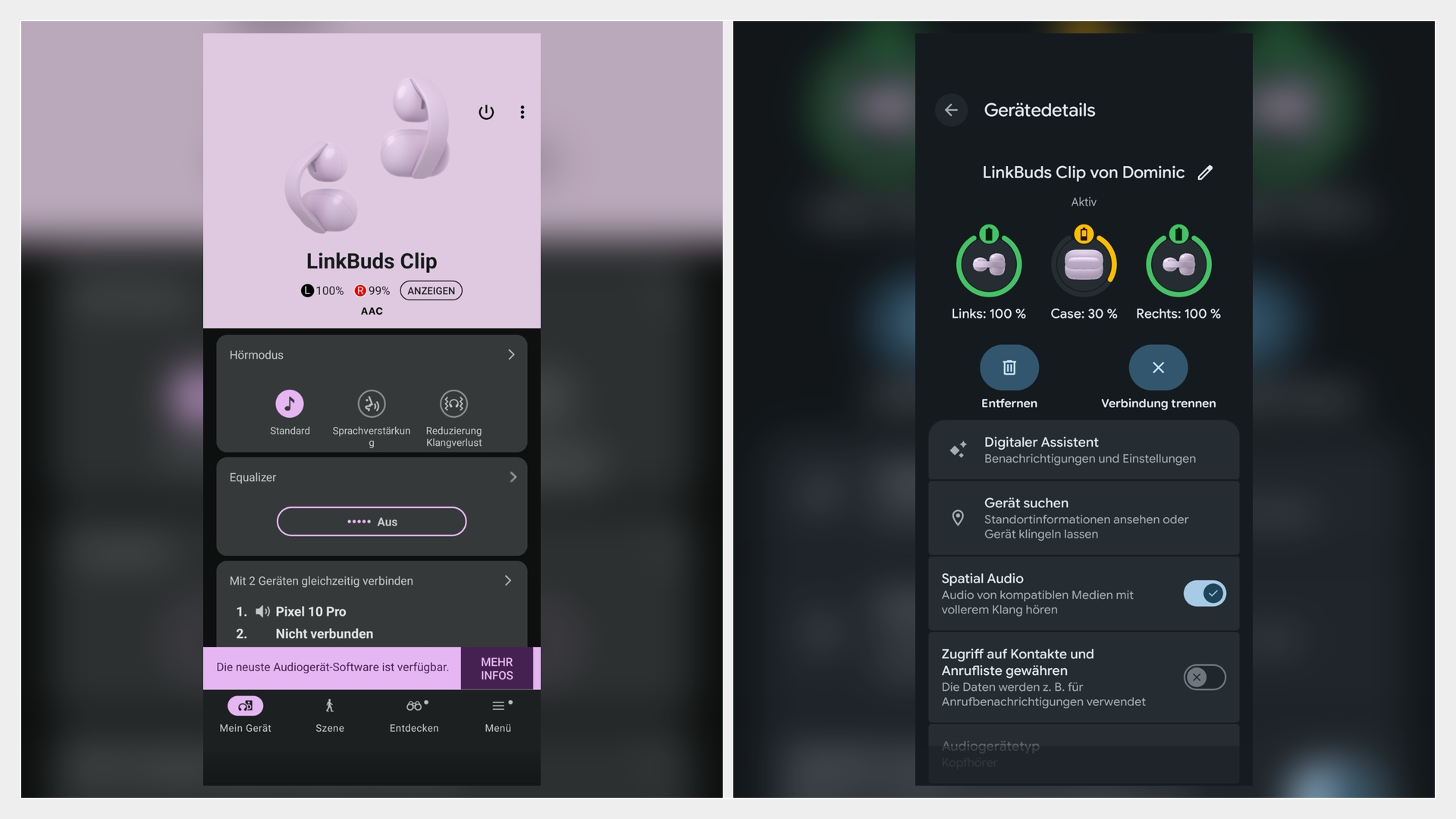Sony LinkBuds Clip: Sony Sound Connect App und Bluetooth-Gerätedetails im Überblick