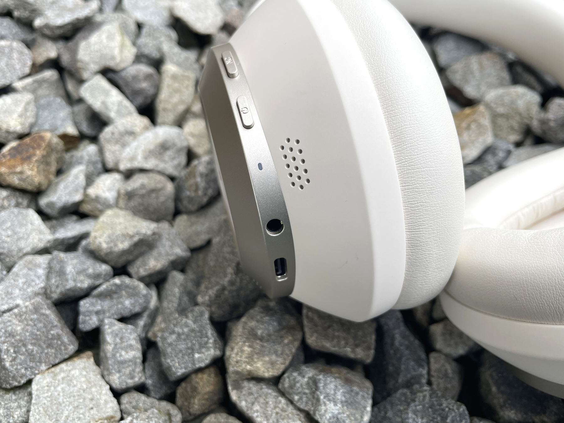 Die App selbst ist insgesamt übersichtlich und klar strukturiert. Die Vielzahl der Funktionen überzeugt uns, alles lässt sich intuitiv bedienen. Alternativ lassen sich die Ohrhörer auch über physische Tasten steuern. Auf der rechten Seite befindet sich die Play/Pause-Taste sowie eine Lautstärke-Wippe. Der Power-Button, der USB-C-Anschluss, der Klinkeneingang und der Noise Cancelling-Button sind auf der linken Seite platziert. Alle Tasten sind leicht zu finden, und nach kurzer Eingewöhnung weiß man genau, welche Funktion sie erfüllen – sehr gut.