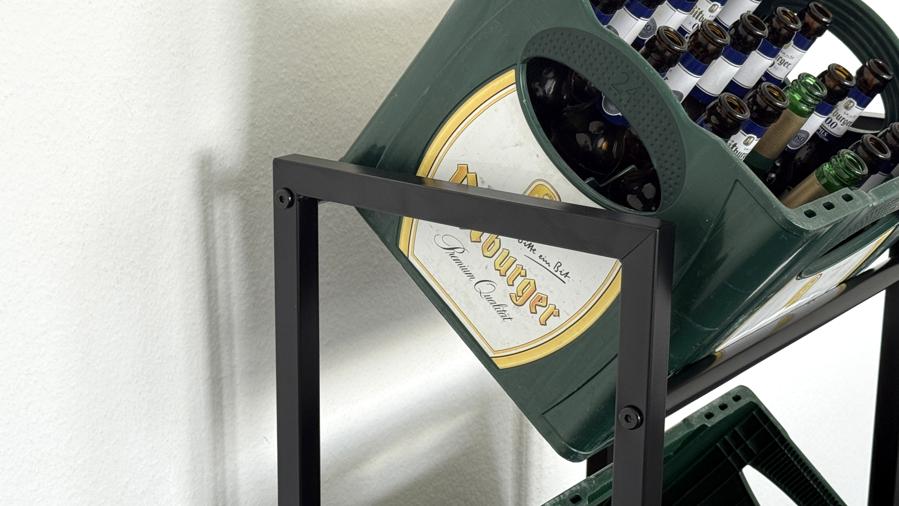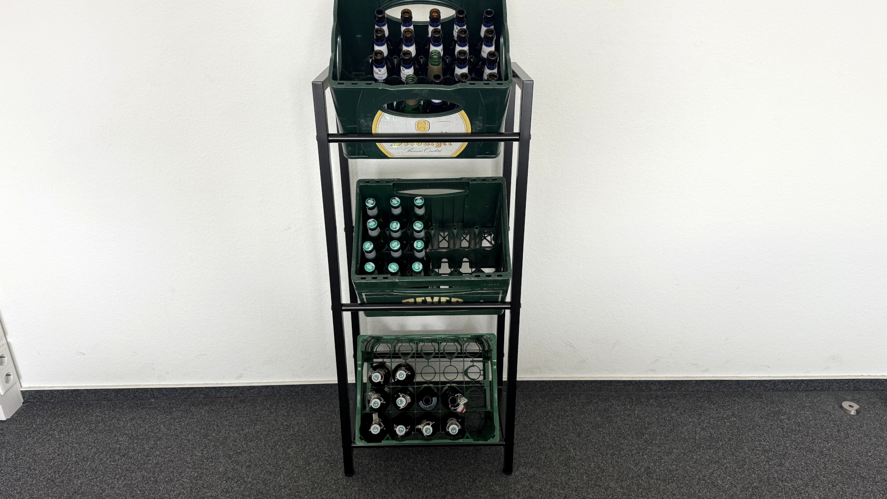Im Test nutzen wir sowohl Wasser- als auch Bierkästen. Beide Formate passen problemlos ins Regal. Hineinstellen und Herausnehmen funktioniert flüssig und ohne Haken oder Kratzen.