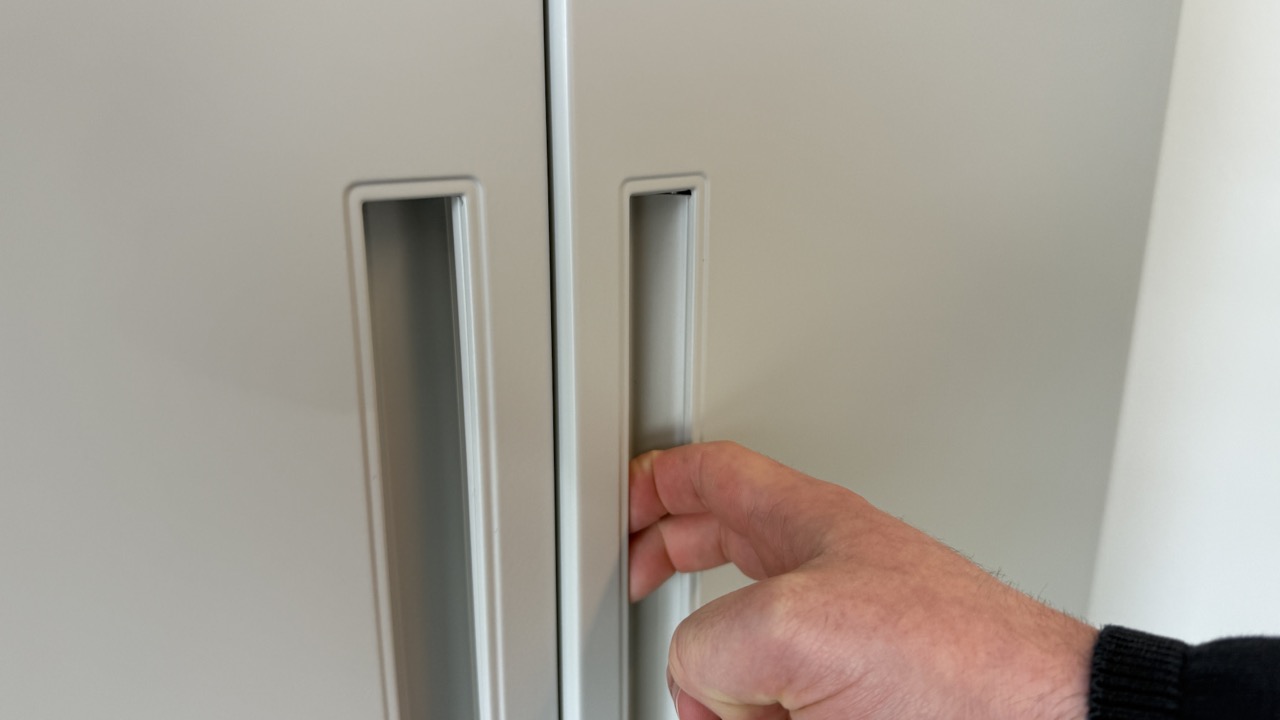 Die Türen laufen sehr leichtgängig, der Verschluss hält sicher, und der Öffnungswinkel reicht aus, um bequem an alle Inhalte heranzukommen. Ein Schwachpunkt ist die Standfestigkeit bei geringer Befüllung: Das Eigengewicht allein bietet keine vollständig ruhige Basis – bei leerem Zustand schwingt der Schrank leicht nach und klappert bei Erschütterungen. Kippgefährdet ist der Schrank dabei nicht, ein wirklich stabiles Standgefühl stellt sich bei geringer Beladung jedoch nicht ein.