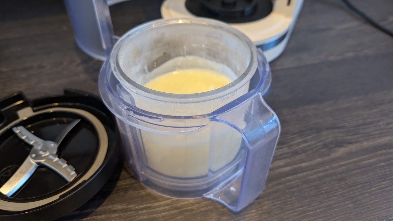 Casheweis: Der erste Durchlauf dauert 3:30 Minuten. Danach wirkt das Ergebnis noch leicht krümelig. Respin läuft anschließend knapp 2 Minuten und bringt das Resultat, das wir erwarten: eine deutlich cremigere, harmonische Masse. Das Ergebnis überzeugt, weil es trotz Einfrierens nicht verwässert wirkt und am Ende eine glatte Textur erreicht.
