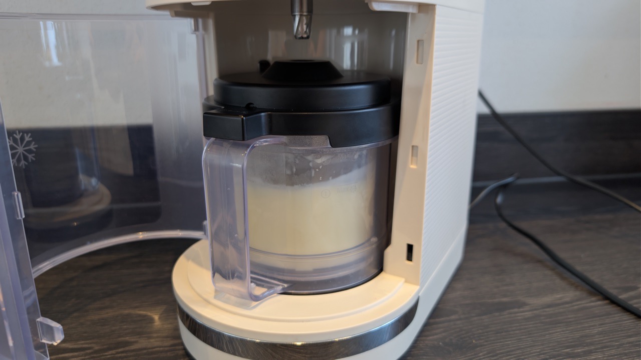 Der mechanische Ablauf klappt im Test zuverlässig: Der Becher sitzt über eine leichte Drehbewegung sicher in der Aufnahme, der Deckel verriegelt sauber, und nach Programmstart koppelt das Werkzeug an den Antrieb an. Danach arbeitet es sich kontrolliert durch die gefrorene Masse.