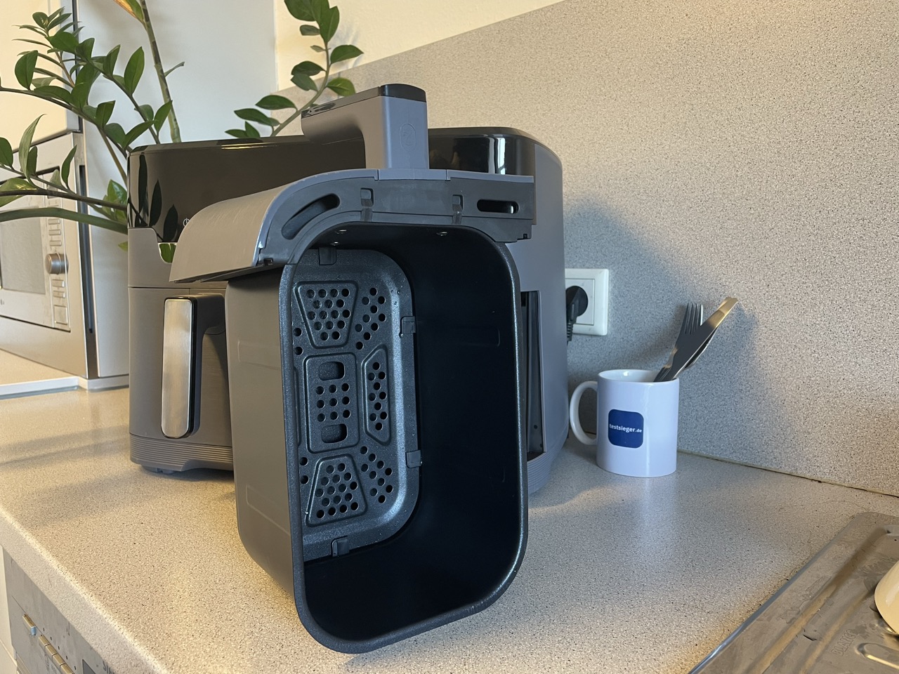 Die Heißluftfritteuse hat ein Fassungsvermögen von 11 Liter. Diese sind auf 2 unterschiedlich große Garkörbe mit 6,5 und 4,5 Litern aufgeteilt. Das Gerät hat Maße von 51,5 x 43 x 38,5 Zentimetern (Tiefe x Breite x Höhe) und wiegt 11,5 Kilogramm. Wir finden für eine Heißluftfritteuse mit zwei Schubladen ist das angemessen
