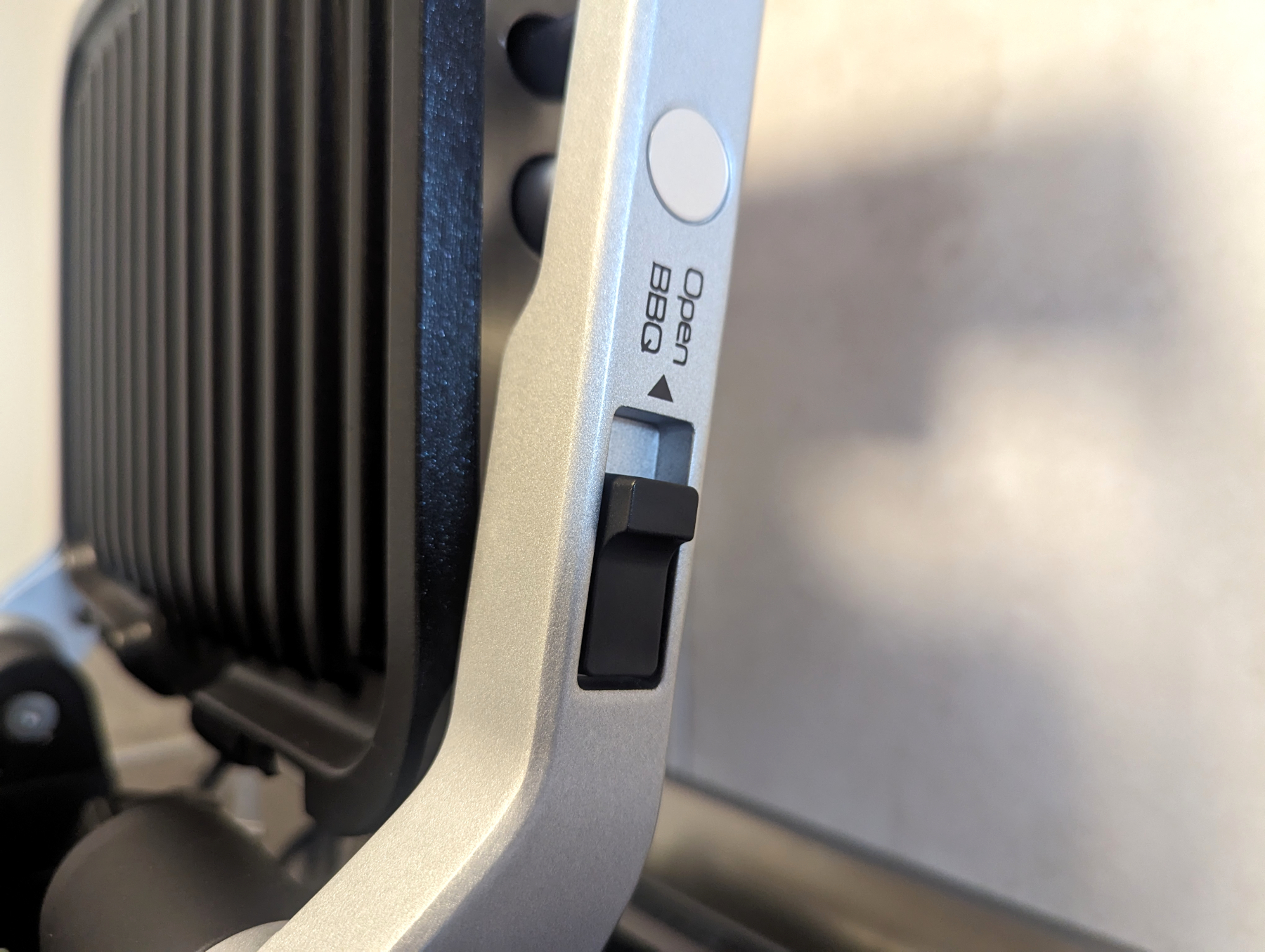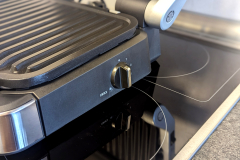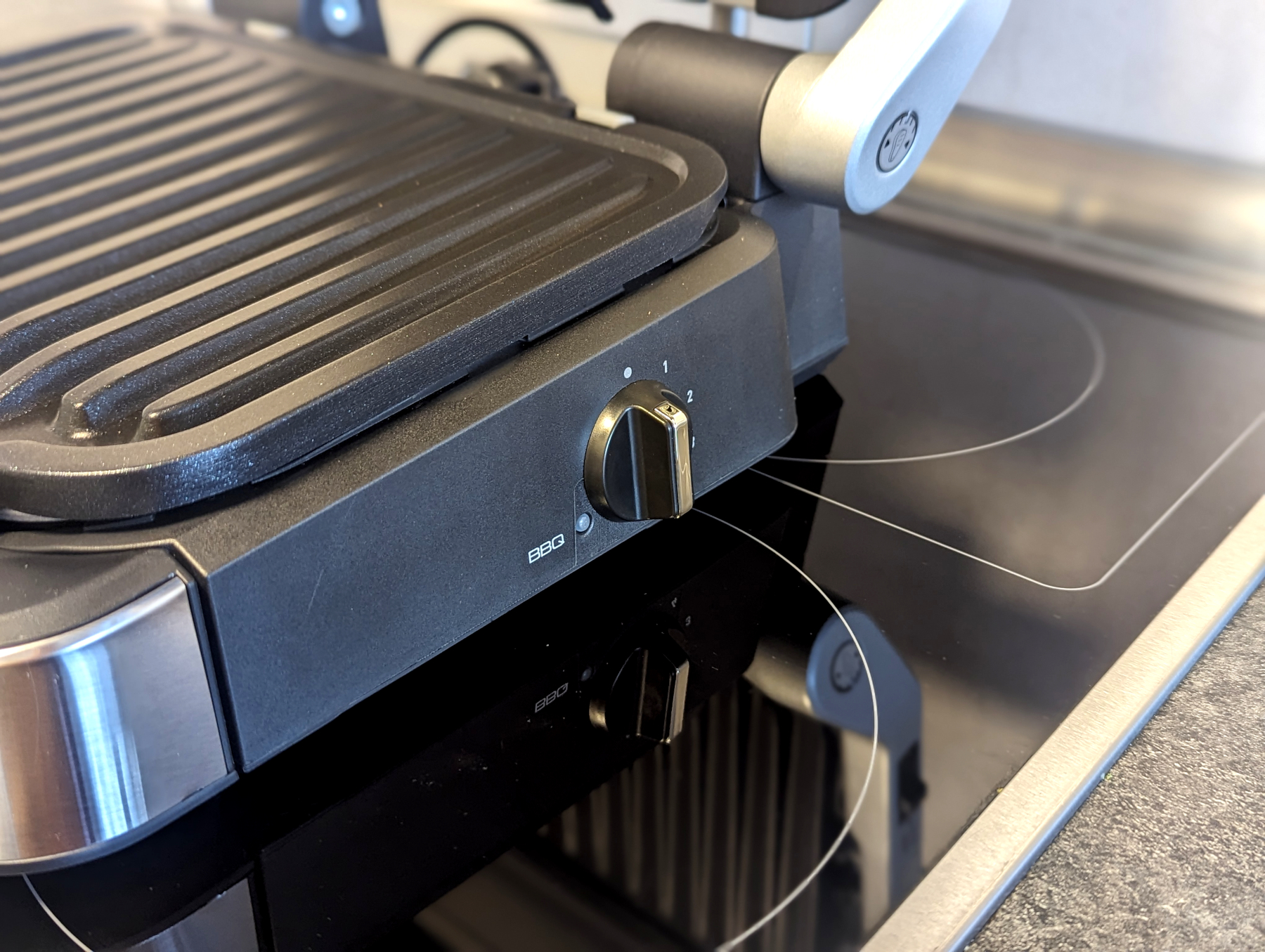 Neben den genannten Grillplatten und der Backform verzichtet der Hersteller auf weiteres Zubehör. Waffelplatten oder ähnliches wie bei anderen Kontaktgrills gibt es nicht. Auch ein Timer für das manuelle Grillen gibt es nicht. Dafür lässt sich das Gerät jedoch vollständig aufklappen, sodass wir für ein BBQ gleich zwei Grillplatten zur Verfügung haben – sehr gut. Die Steuerung der Temperatur läuft hierbei nicht über die Tasten am Griff, sondern über einen leichtgängigen Drehregler an der rechten Unterseite des Gerätes.