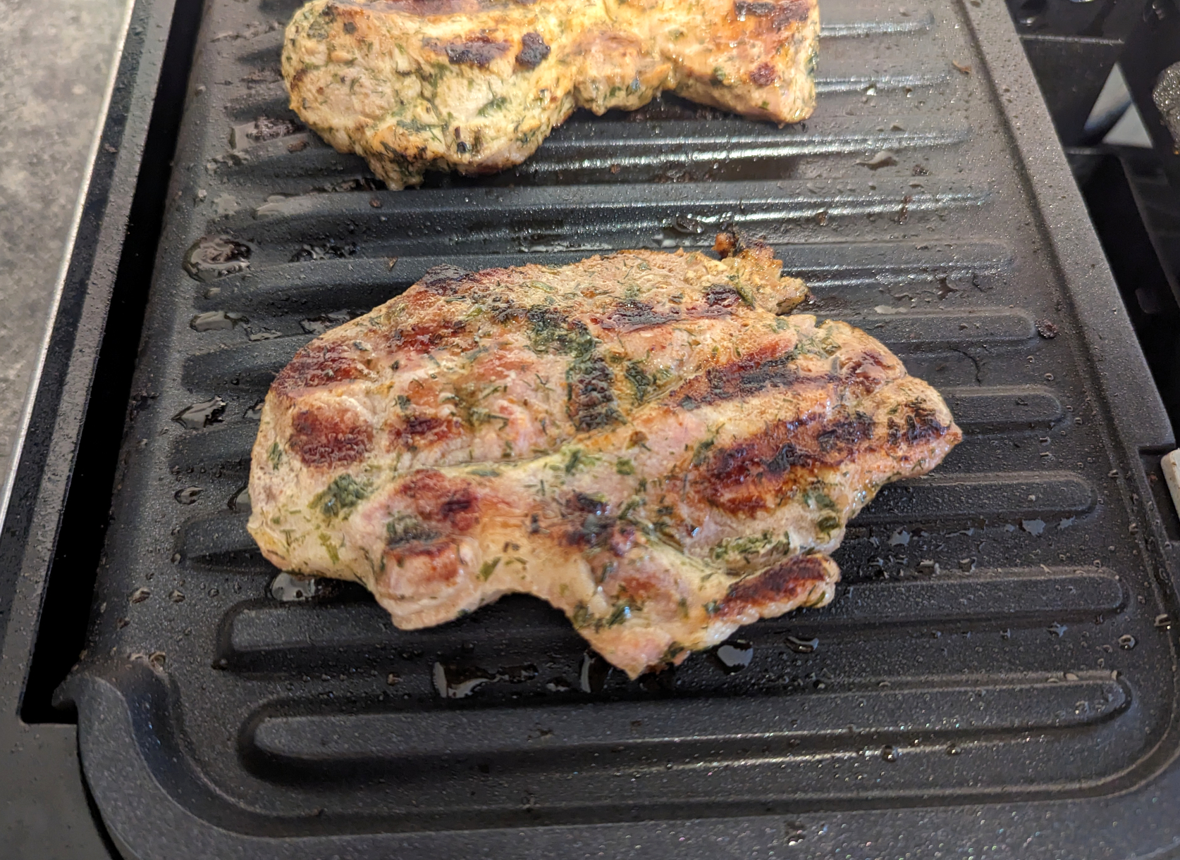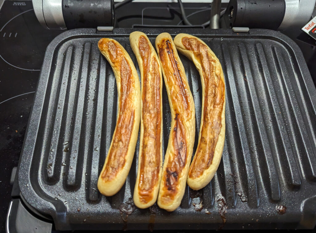 Zunächst braten wir Grillwürste, um die Kontaktgrillfunktion sowie die automatischen Programme zu prüfen. Dafür wählen wir das Würstchenprogramm und starten die Zubereitung über die OK-Taste. Aus dem Kaltstart benötigt das Gerät etwa 4:30 Minuten zum Vorheizen – ein durchschnittlicher Wert. Danach ertönt ein akustisches Signal und wir können die Würstchen einlegen. Nachdem wir den Grill wieder schließen, beginnt der Garvorgang. Nach etwa 9 Minuten meldet uns die Farb-Anzeige sowie der entsprechende Sound, dass die Zubereitung abgeschlossen ist. Das Ergebnis ist überzeugend. Die gegrillten Würstchen sind gleichmäßig und mit schönen Grillstreifen gegart. Durch das automatische Programm müssen wir auch nicht permanent nach den Lebensmitteln sehen, was uns ein wenig Zeitaufwand erspart. Zwar kommt das Ergebnis nicht an einen klassischen Gas- oder Kohlegrill heran, kann aber durchaus mit anderen Kontakt- und Elektrogrills mithalten.