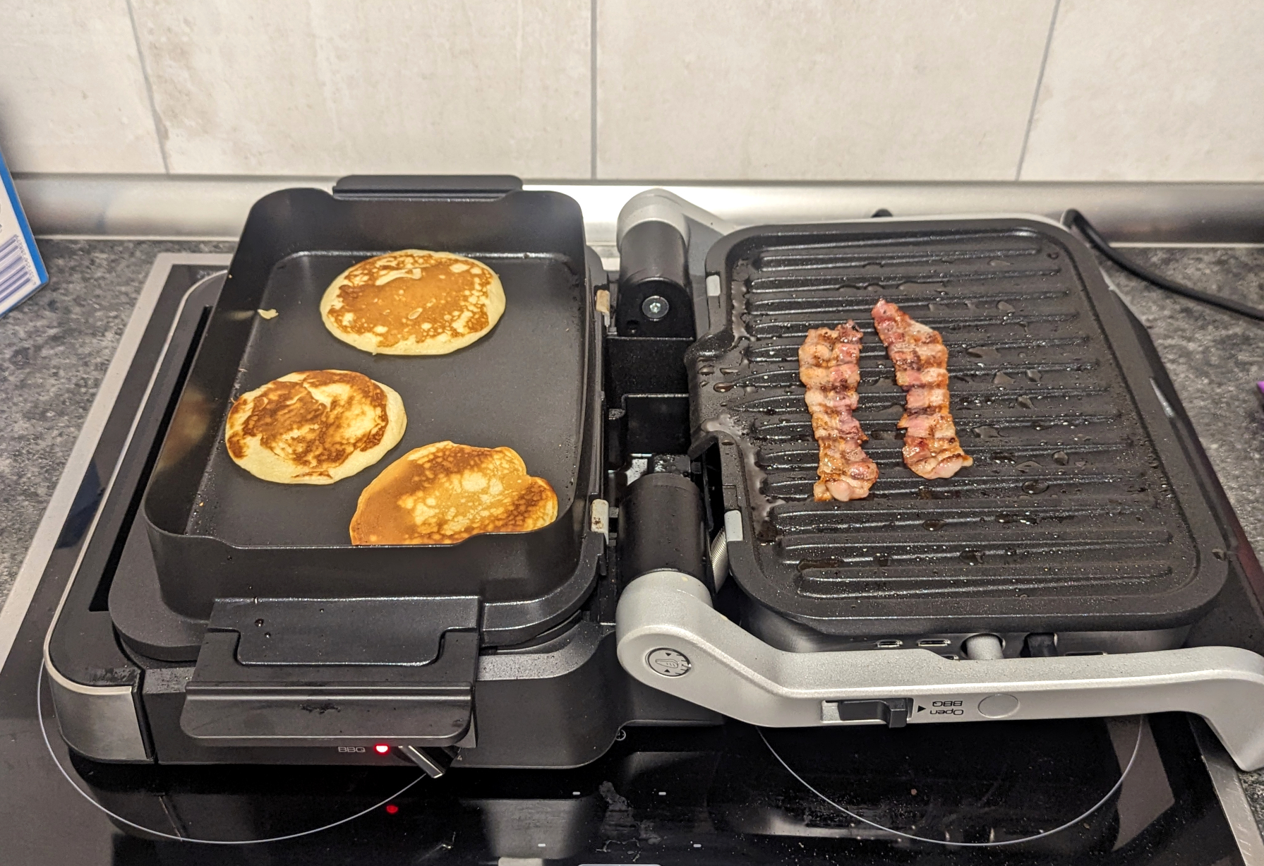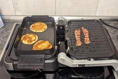 Im letzten Test blicken wir auf die Zubereitung eines „ganzen“ Gerichtes. Dazu klappen wir den Kontaktgrill wieder vollkommen auf und nutzen nochmal die Backform. Auf der Grillplatte rösten wir Bacon, auf der anderen Seite braten wir Spiegeleier. Hinzu kommen danach noch kleine Pfannkuchen. Die Ergebnisse sind erneut überzeugend. Jedoch limitiert die kleine Backform die Anzahl der Spiegeleier und Pfannkuchen erheblich. Daher können wir die Zubereitung ganzer Gerichte nur für bis zu 2 Personen empfehlen. Bei größeren Mengen macht eine eigene Pfanne mehr Sinn.