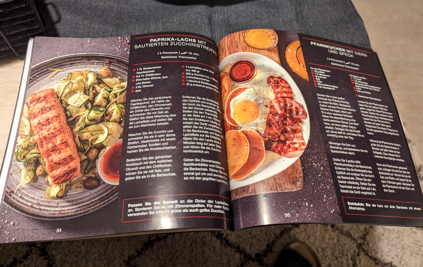 Daneben liegt im Lieferumfang auch ein Rezeptbuch bei. Dieses gibt verschiedene Anregungen für passende Gerichte, die die Funktionsweise des Kontaktgrills zusätzlich verdeutlichen. Dies ist insbesondere praktisch für Nutzerinnen und Nutzer, die die beiliegende Backform nutzen möchten. Diese lässt sich einfach einsetzten, indem man die unten liegende Grillplatte entfernt. Danach müssen wir die obere Platte wieder schließen und die Garung im manuellen Modus starten. Durch den nun geschlossenen Zustand bekommen wir eine Art Backofen, da deutlich weniger Hitze entweichen kann. Die Größe der Back- und Auflaufform ist jedoch aus unserer Sicht etwas zu klein. Für die Versorgung von mehr als 2 Personen reicht es in der Praxis nicht. Fraglich ist deshalb, warum das Rezeptheft Gerichte für 8-10 Personen anpreist, die alleine von den vorgeschlagenen Mengenangaben bereits das Volumen der Form füllen und nur für maximal 2 Personen ausreichen.