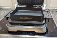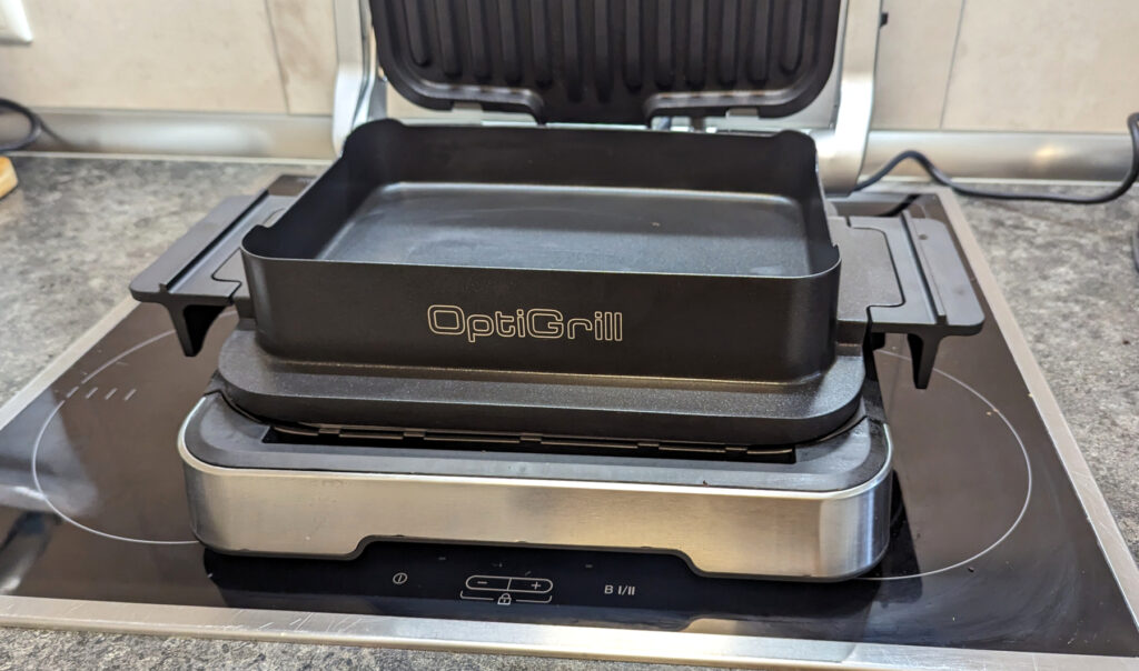 Neben dem bereits erwähnten Backofen-Modus bietet der OptiGrill 4in1 GC774D auch die Zubereitung ganzer Gerichte an. Dazu tauschen wir wie im Backofen-Modus die untere Grillplatte durch die Back- und Auflaufform aus. Anstatt die obere Platte nun zu schließen, klappen wir die beiden Kontaktflächen wie im BBQ-Modus vollkommen um. So haben wir in der Praxis auf der linken Seite eine ebene Bratfläche und auf der rechten Seite eine klassische Grillplatte. Dies erweitert die Zubereitungsmöglichkeiten, ist aber kein Alleinstellungsmerkmal auf dem Markt. Die Steuerung der Temperatur erfolgt ebenfalls über den verbauten Drehregler für das BBQ. Dies ist zwar einfach und simpel, führt aber dazu, dass wir die Temperatur der Heizelemente für den oberen und unteren Teil nicht separat einstellen können. Dies ist etwas schade, da die Zubereitung ganzer Gerichte je nach Fall unterschiedliche Temperaturen benötigt.